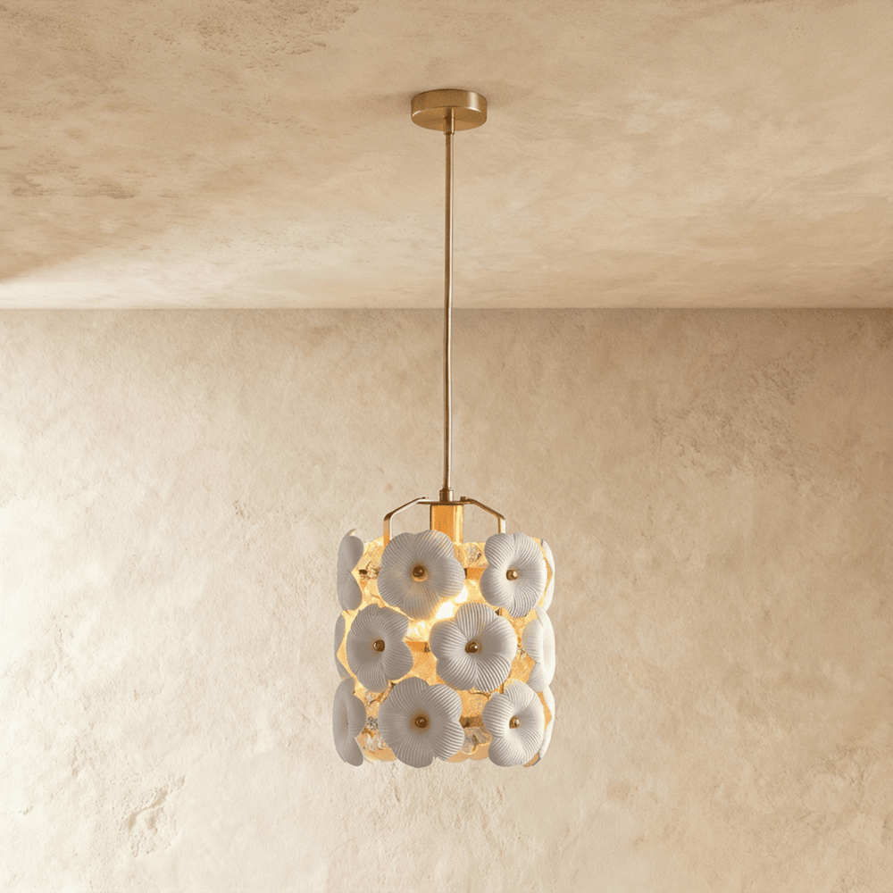 The Lazik Pendant Light is an exquisite light fixture crafted from copper with a ceramic lampshade, designed to resemble delicate, layered flower petals. Each petal-like piece features fine ridged textures and is centered with a golden accent, creating a sophisticated floral arrangement. The interplay of matte ceramic and warm metallic touches gives this pendant a luxurious yet organic aesthetic. Perfect for dining areas, living rooms, or entryways, it transforms any space into an elegant focal point. This light fixture embodies artistic craftsmanship and refined contemporary style.