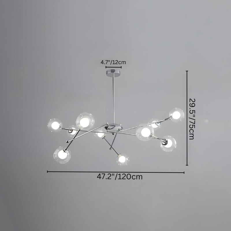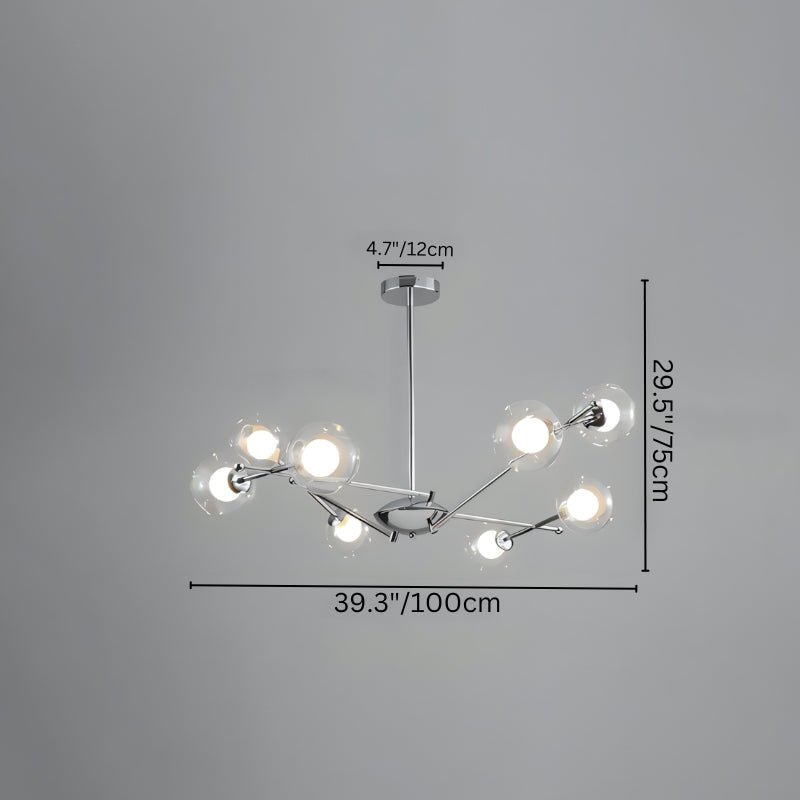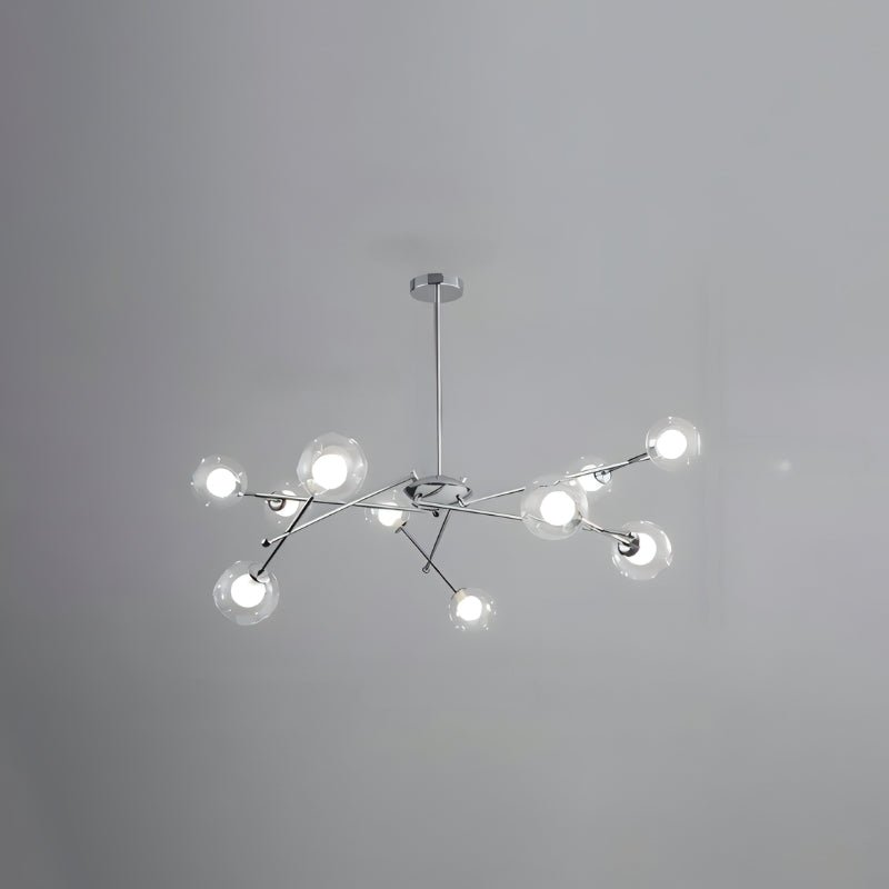 The Levya Chandelier is a modern light fixture featuring asymmetrically arranged iron rods with spherical glass shades. Its polished chrome finish and clear glass globes create a balanced, ambient glow. It is designed for contemporary interiors and suits dining rooms, kitchens, and living spaces. Crafted from durable iron and glass, it blends industrial and modern styles, making a bold statement.