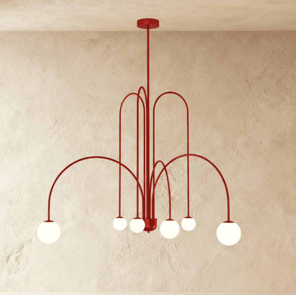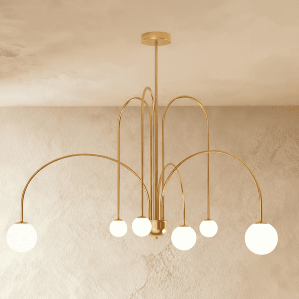 Discover the captivating blend of contemporary and Art Deco design in the stunning Lucille Chandelier. Featuring gracefully arched iron frames arranged in a mesmerizing geometric pattern, it is adorned with hand-blown opal glass globes that emit a warm, romantic glow. This unique chandelier transforms any space, making it an ideal centerpiece above a dining table or in a grand entryway.