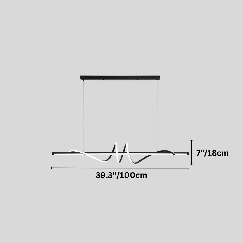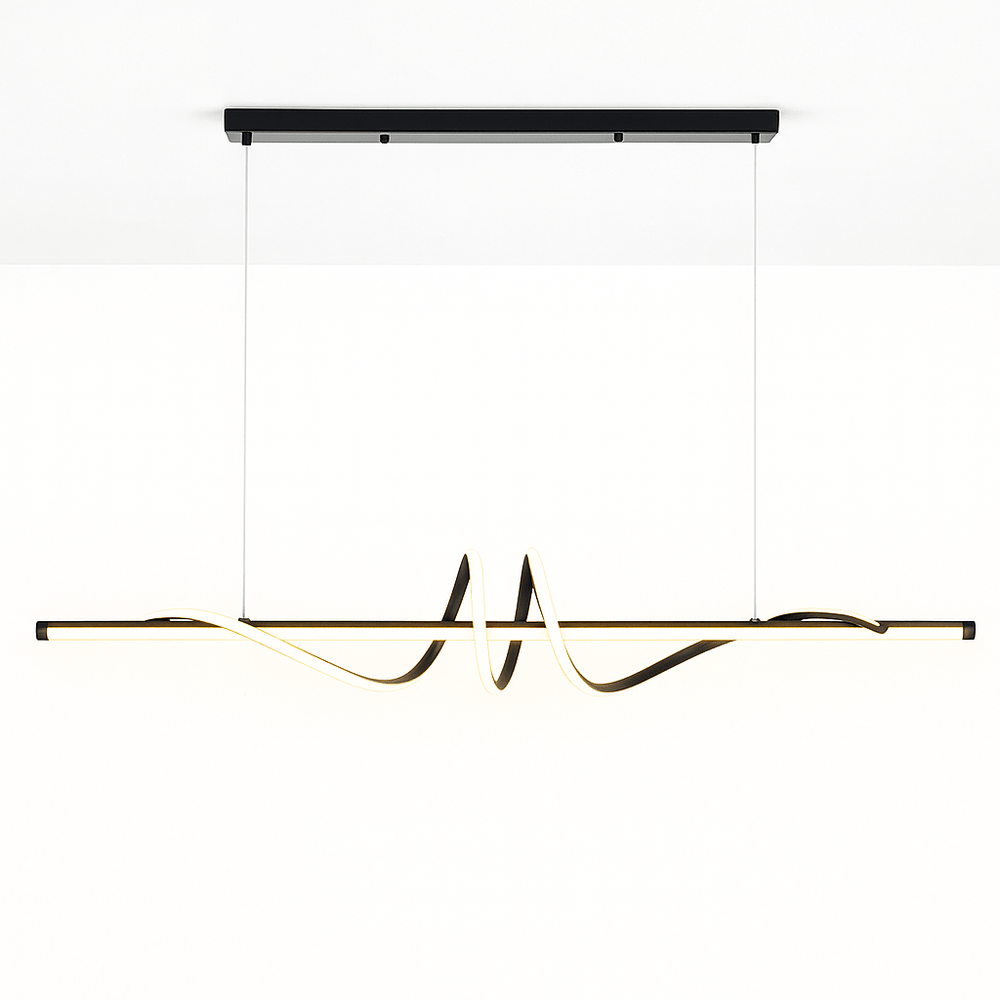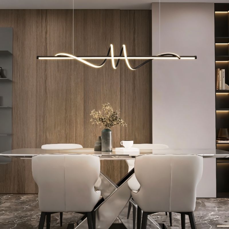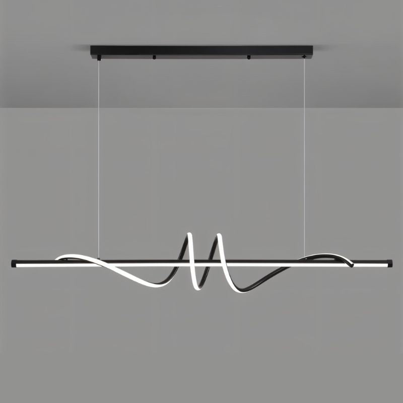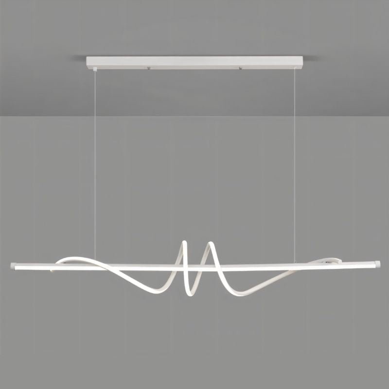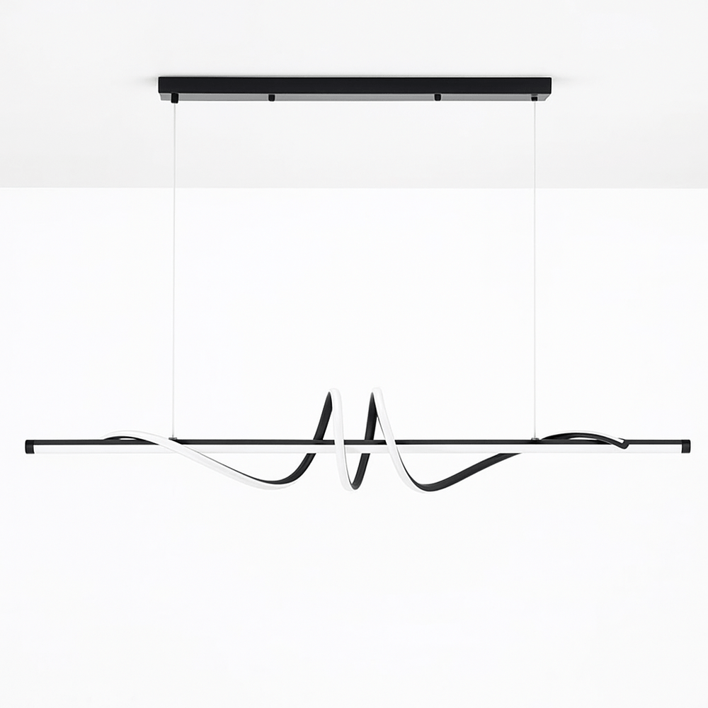 The Lumexis Pendant Light is a modern suspended light fixture with an abstract linear design featuring fluid, wave-like curves. Crafted from iron and aluminum, it is available in two sizes and three colors, offering versatility for various interiors. Its minimalist aesthetic makes it ideal for dining areas, kitchen islands, and contemporary living spaces. The suspended structure ensures balanced illumination while serving as a striking focal point. Perfect for modern and industrial-style interiors, it seamlessly blends functionality with artistic design.