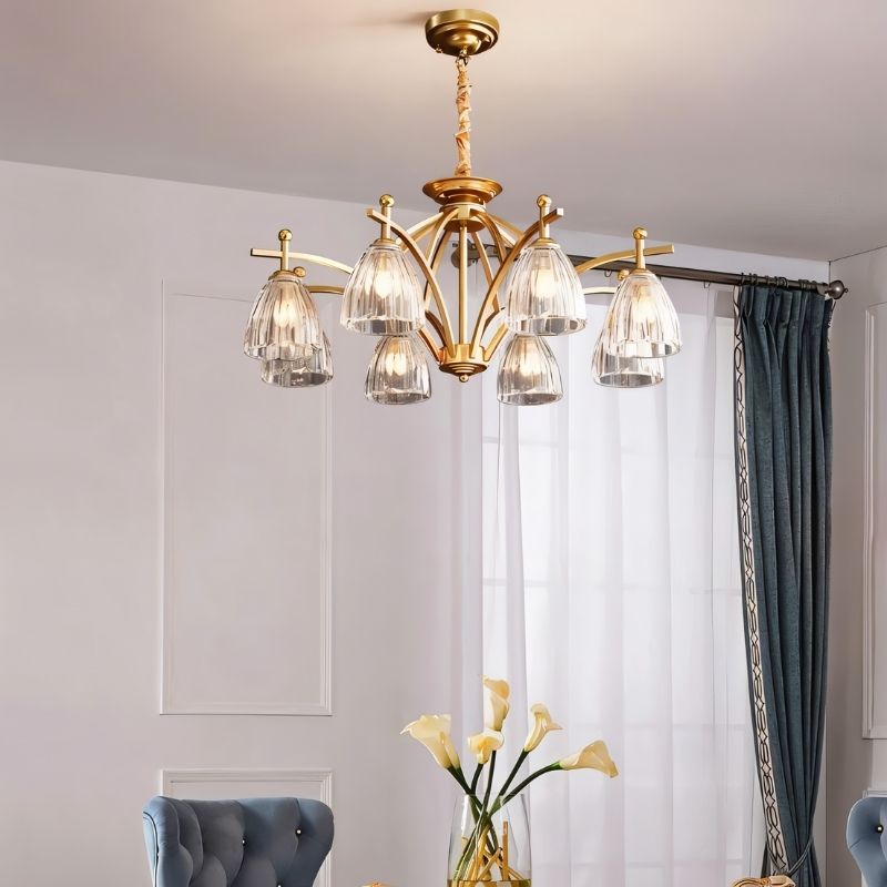 The Lumintra Chandelier is a striking light fixture crafted from glass and iron, featuring an arched frame with gracefully extended arms. Each head is fitted with a textured glass shade that enhances light diffusion, creating a refined ambiance. Available in 5, 6, 8, and 10-head configurations, it suits dining areas, living rooms, and entryways. Its symmetrical design and gold-toned finish complement modern and classic interiors. Ideal for high ceilings, this chandelier delivers both structure and illumination with timeless appeal.