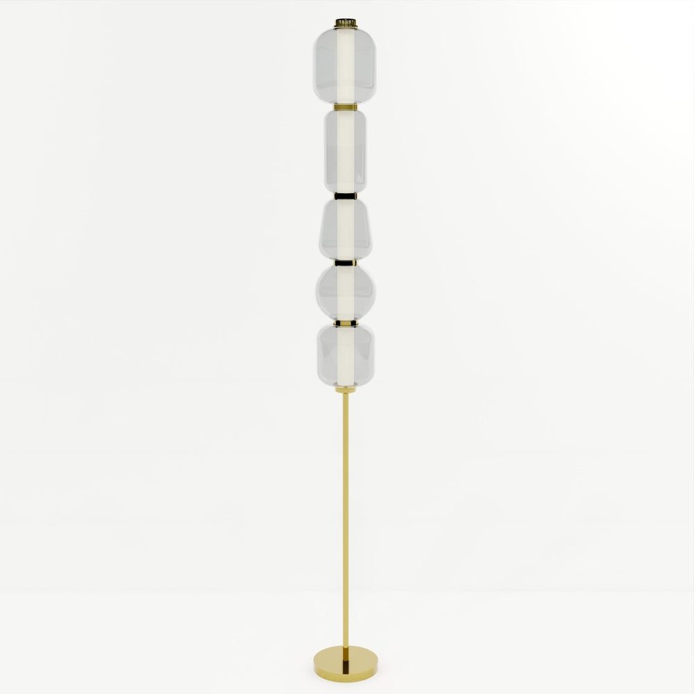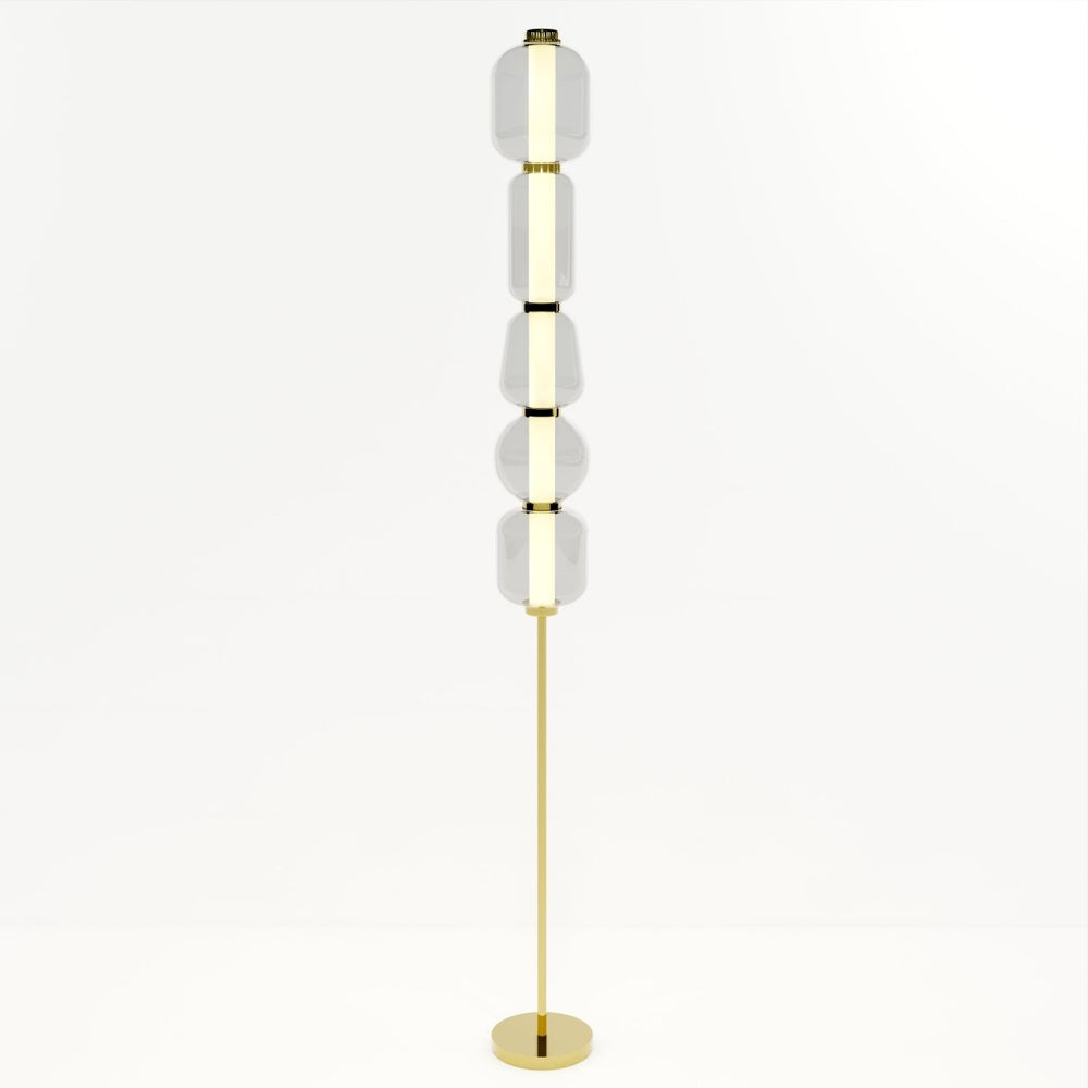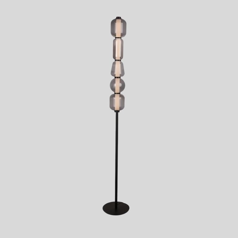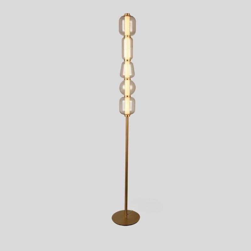 The Lyris Floor Lamp is a modern light fixture made from metal, glass, and acrylic, featuring a vertical design with stacked translucent glass orbs that emit a warm, ambient glow. Its sleek gold metal base adds a luxurious touch, making it an ideal statement piece for contemporary living rooms, bedrooms, or offices. Combining artistic elegance with functionality, this light fixture enhances any modern interior space.