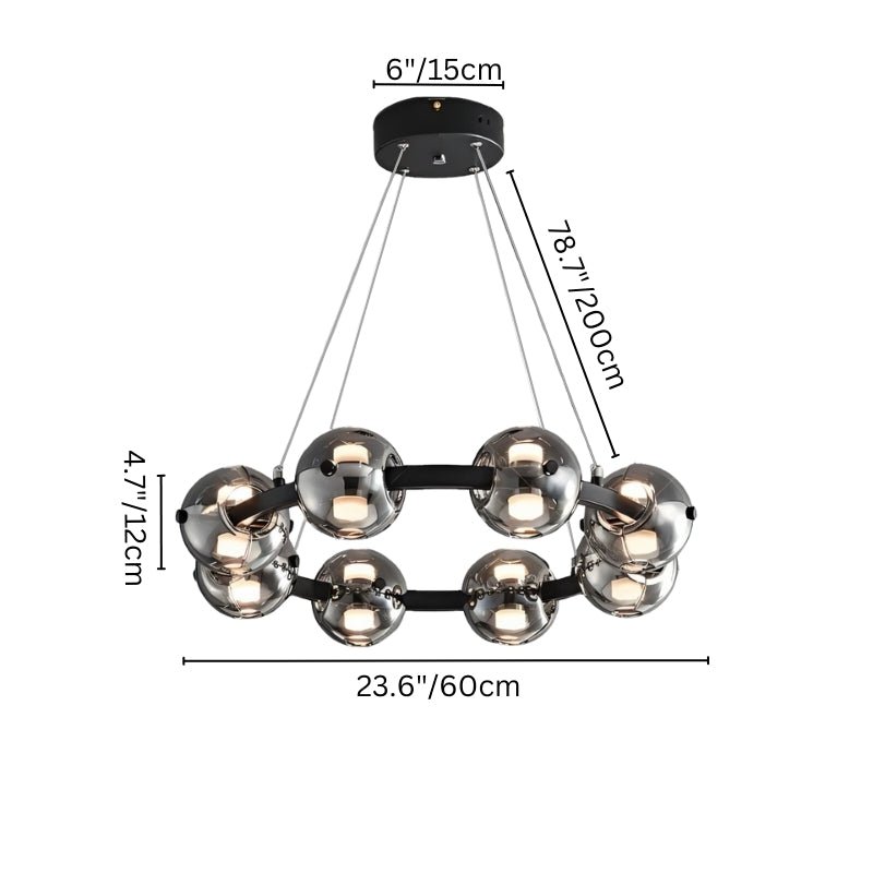 Sleek aluminum frame with smoked glass orbs delivers stylish ambient lighting — perfect for dining rooms, living spaces, and entryways.