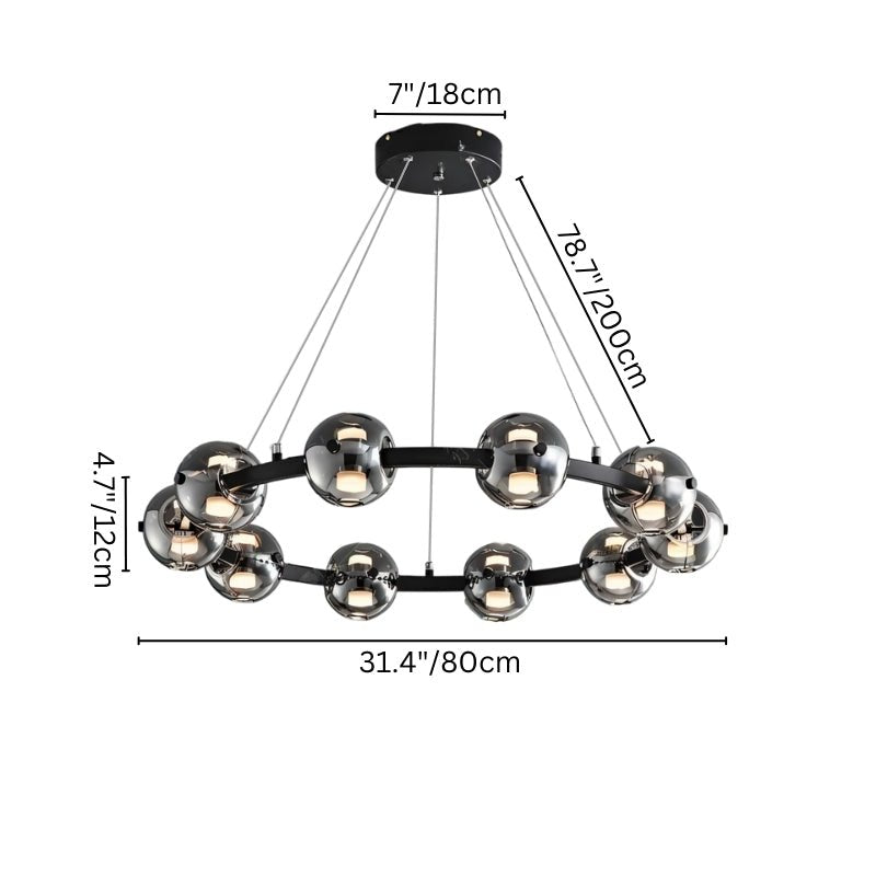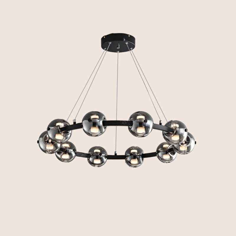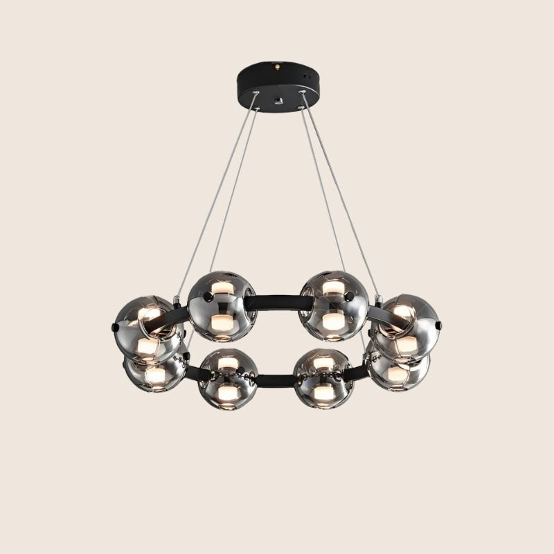 The Malay Round Chandelier is a modern aluminum light fixture featuring a circular frame with multiple smoked glass orbs, each housing an internal light source. Its sleek design and balanced arrangement make it perfect for contemporary spaces like dining rooms, living areas, and entryways. The adjustable suspension cables allow customization for different ceiling heights. Ideal for both residential and commercial interiors, this chandelier provides stylish ambient lighting.