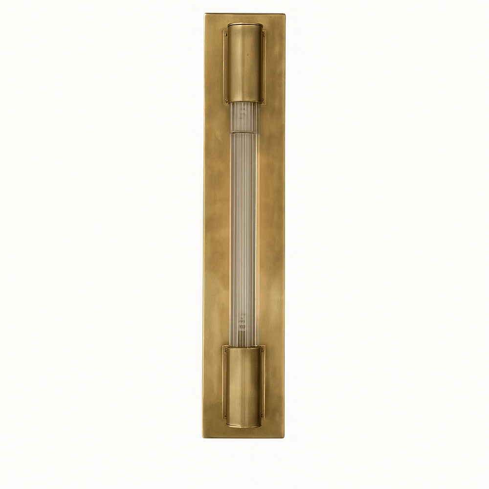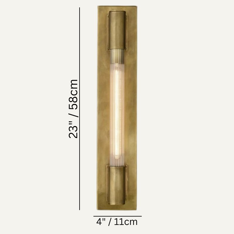 Product Dimensions: 4" x 23" / 11 x 58cm Weight: 2.7Kg Material: Iron, Glass Finish: Gold, Black Light Source: Integrated LED Dimmable: No Voltage: 90-260VAC Installation Type: Wall Mount Certifications: UL, CCC, CE, CQC, EMC, FCC, GS, LVD, PSE, ROHS, SAA, and VDE