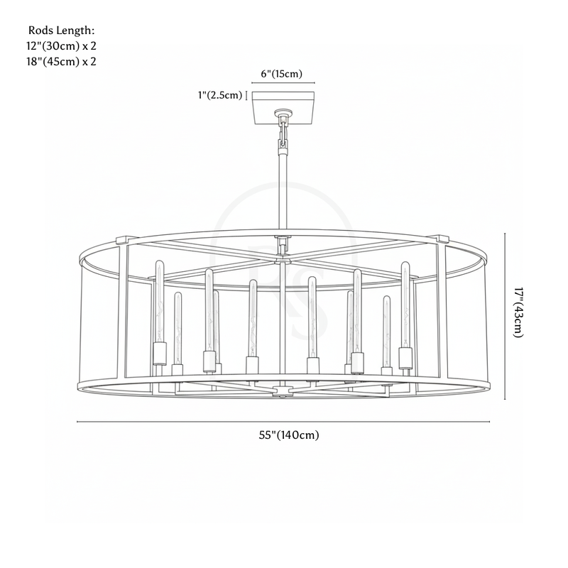12 Lights - 55" x 17" / 140 x 43cm / 120W Weight: 50 lbs, 75 lbs, 124 lbs Material: Copper, Glass Finish: Brass, Black, Nickel Light Source: LED Light Bulb (replaceable) Bulb Included: Yes Number of Bulbs: 8, 12 Bulb Base: E26 Dimmable: No Wattage: 80W, 120W Lumens: 100lm/watt Voltage: 90-260VAC Installation Type: Pipe Erected Chain/Cord Length: Two 12" + Two 18" Rods Adjustable Cord: Yes Canopy/Backplate Dimensions: 6" / 15cm Sloped Ceiling Compatible?: Upon Request Certifications: UL, CCC, CE, CQC, EMC, FCC, GS, LVD, PSE, ROHS, SAA, and VDE