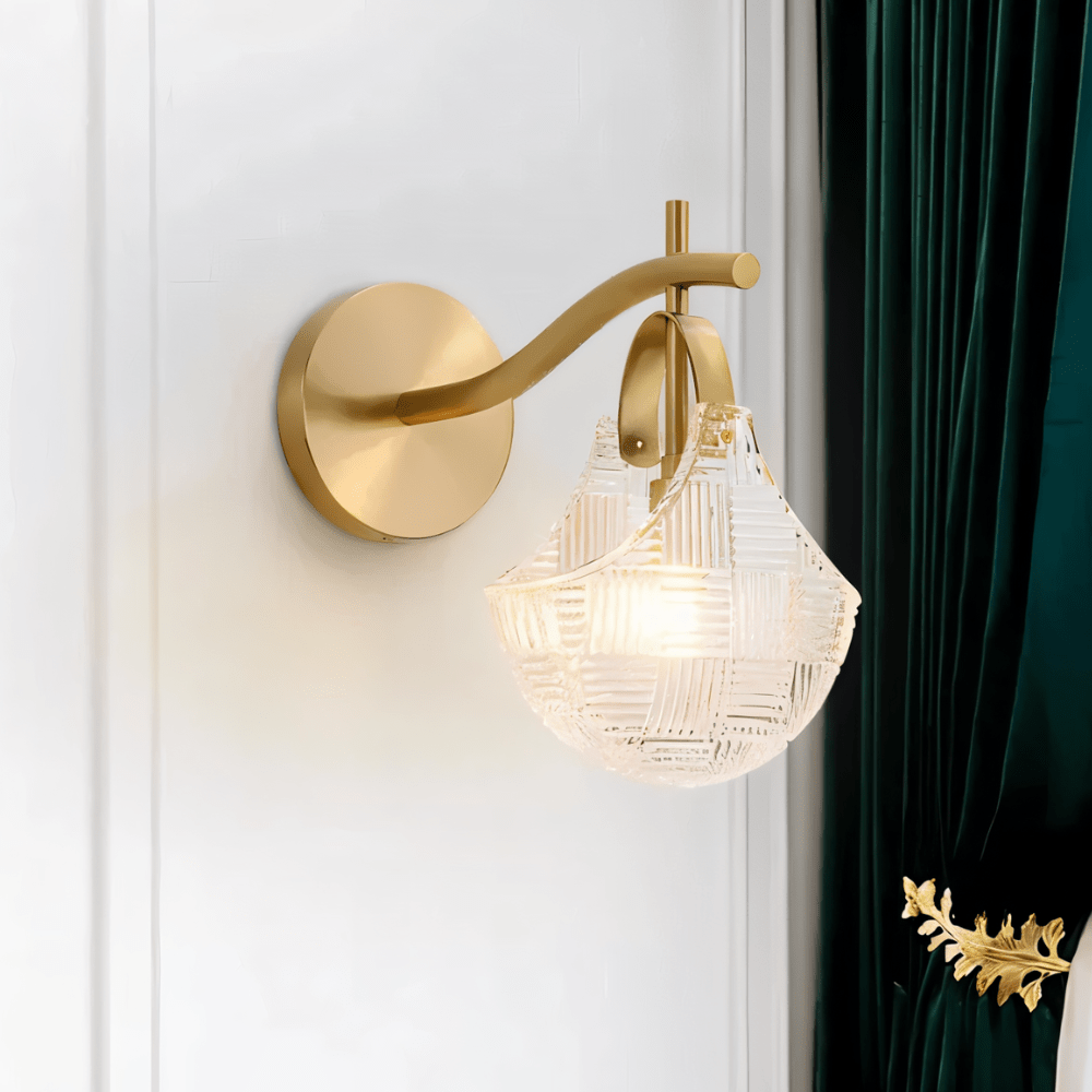 The Minel Wall Lamp combines a sculptural brushed copper arm with a fluted glass shade featuring a modern plaid pattern for elegant wall illumination. This light fixture is crafted from durable copper and precision-cut glass, offering a refined balance of luxury and function. Its curved mount and compact profile make it ideal for hallways, bedrooms, or vanity areas. The wall-mounted design delivers focused ambient light while serving as a decorative accent. Suitable for both residential and boutique hospitality settings.