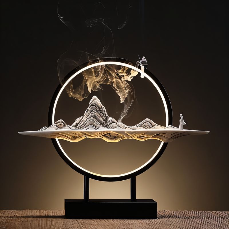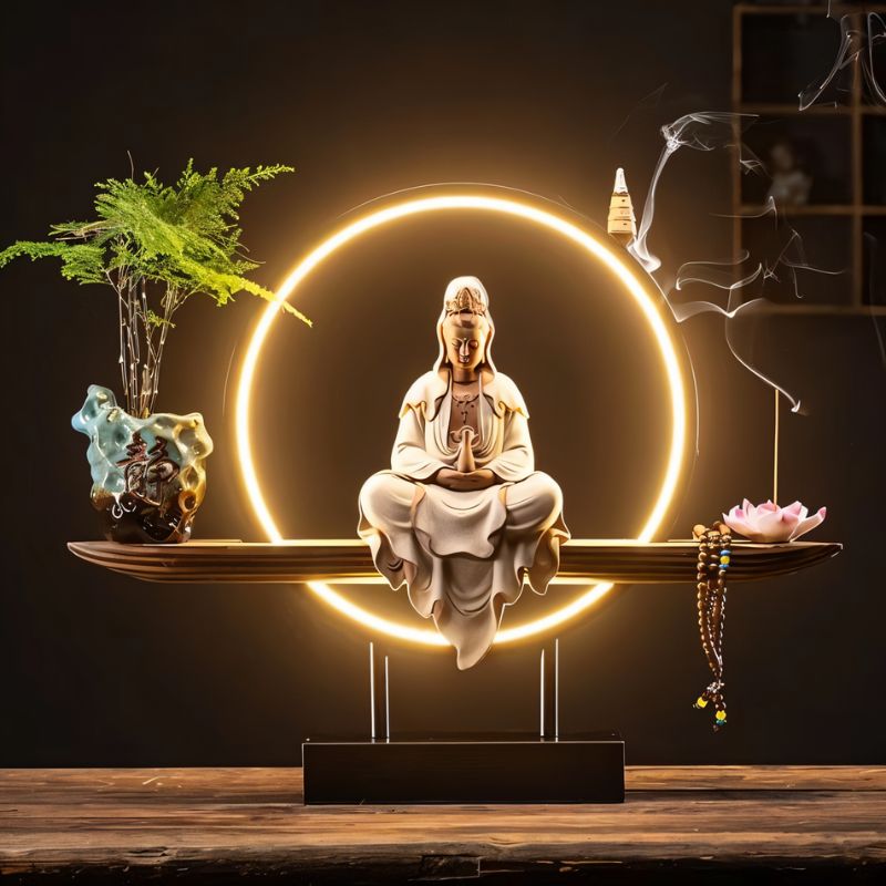 Clay base and metal frame combine for a serene, spiritual ambiance — perfect for desks or shelves, enhancing relaxation with gentle LED lighting and incense.