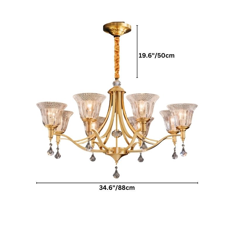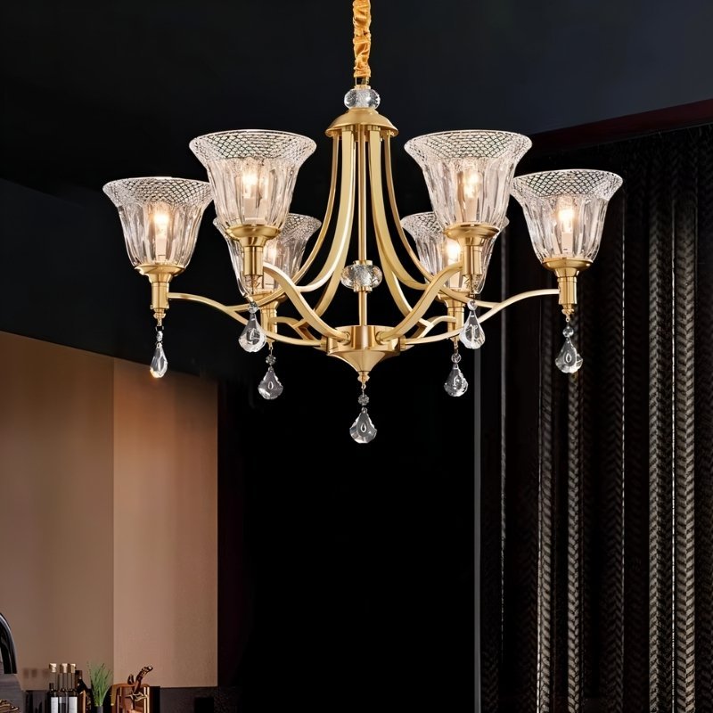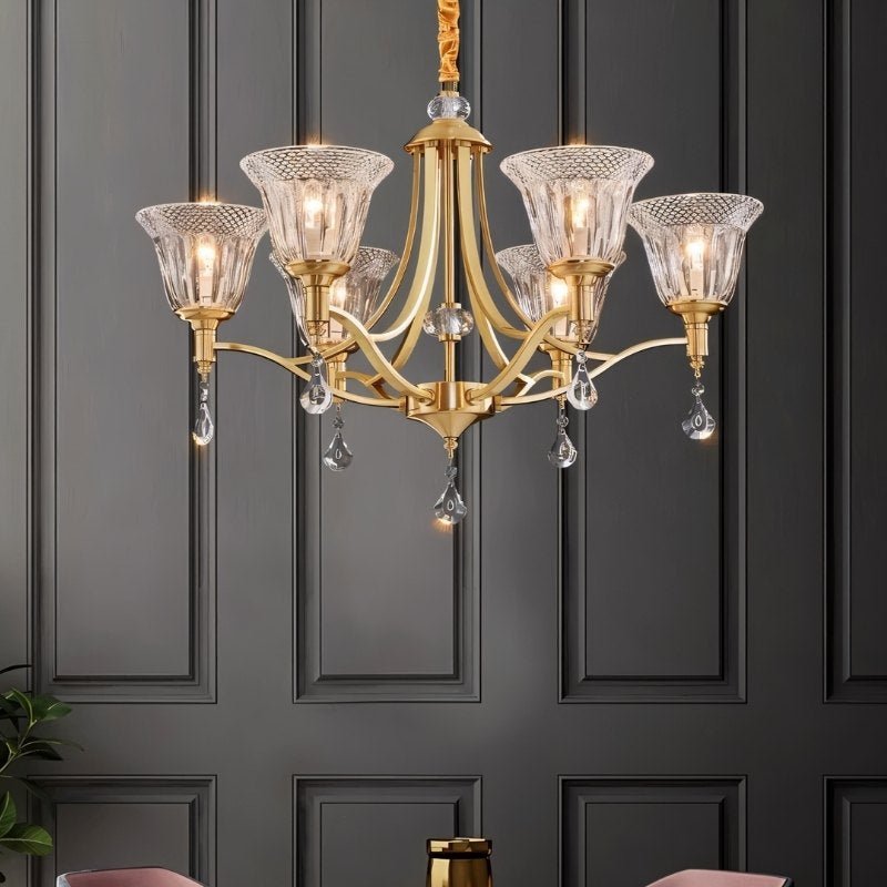 The Nestor Chandelier features an elegant iron frame with gracefully curved arms and intricate glass shades. Crystal accents add a touch of luxury, reflecting light beautifully. Its balanced proportions and classic detailing make it ideal for dining rooms, living spaces, and grand interiors seeking a timeless statement piece.