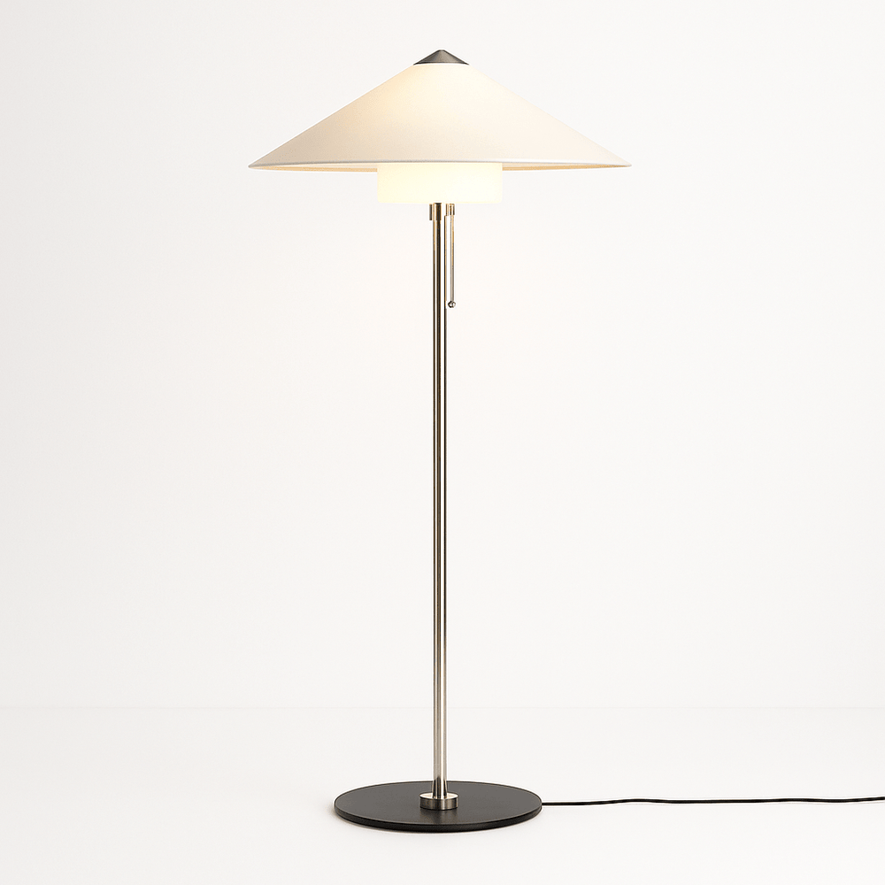 The Oriel Floor Lamp is a sleek light fixture made from aluminum, iron, and fabric. Its minimalist design includes a slim metallic frame and a wide, conical fabric shade for soft, diffused lighting. Perfect for living rooms, bedrooms, or offices, it offers a blend of timeless style and functional illumination, enhancing any modern interior.