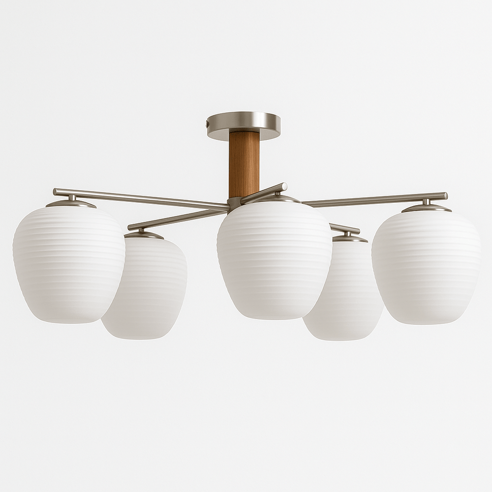 The Oskir Ceiling Lamp combines a sleek nickel frame with warm wooden accents and frosted ribbed glass shades, creating a balanced and sophisticated light fixture. Its five curved arms provide soft, diffused illumination, making it ideal for living rooms, dining areas, and lounges. Designed for modern and transitional spaces, its durable wood, nickel, and glass construction ensures longevity and style.