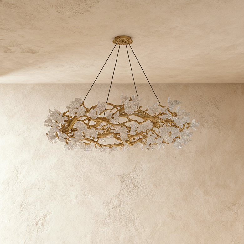 The Petala Crystal Round Chandelier beautifully marries innovative lighting design with natural aesthetics through its split petal-inspired shapes and intricate crystal-adorned brass body, creating a luxurious yet nature-infused statement piece that captivates and elevates any space.