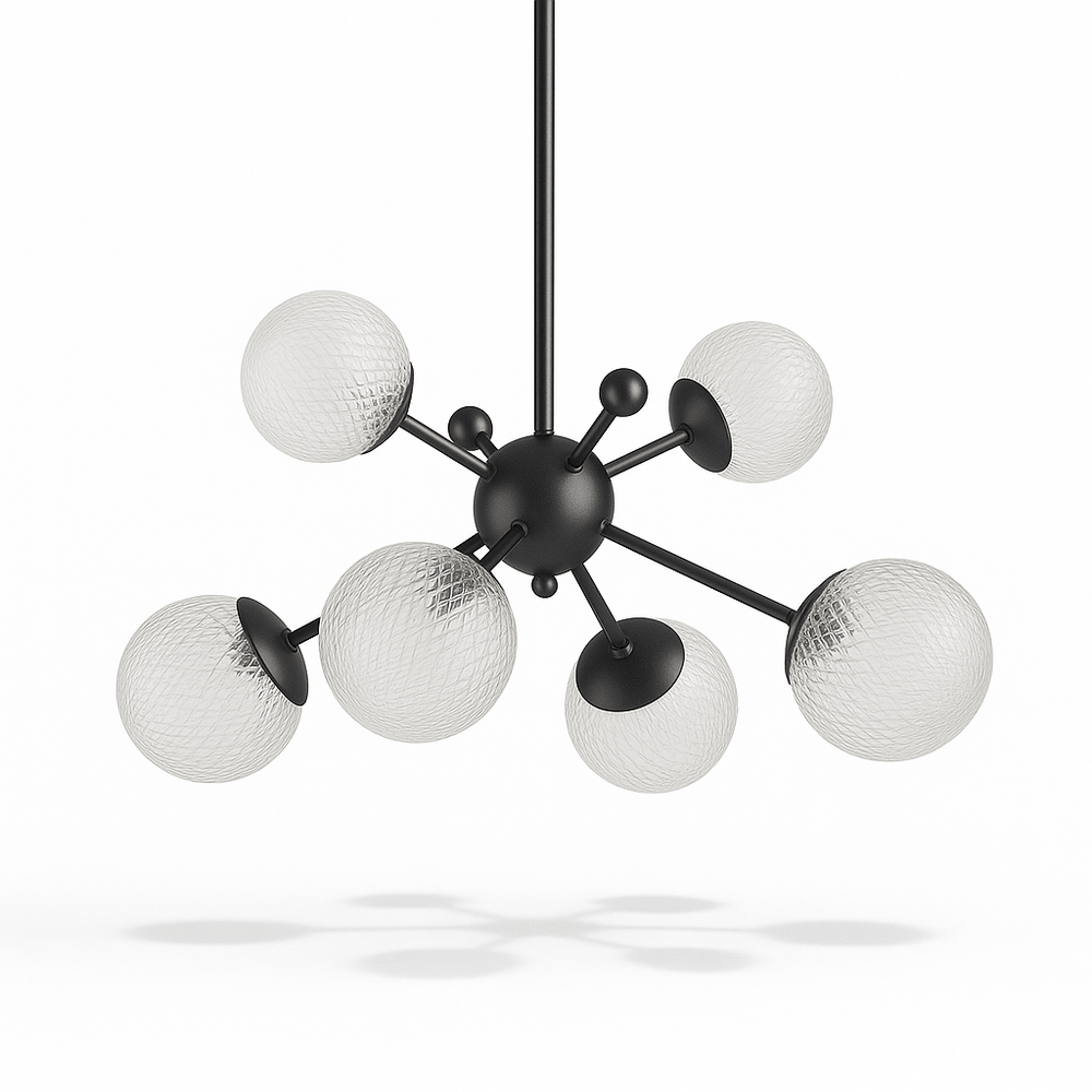 The Pring Chandelier features a starburst-inspired design with multiple iron arms, creating a striking modern look perfect for contemporary and mid-century interiors.