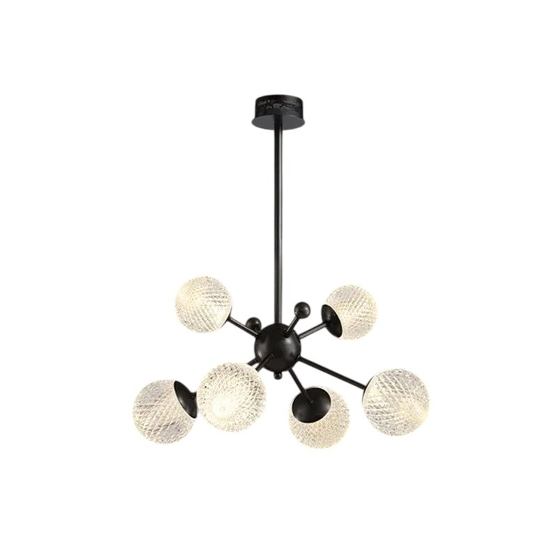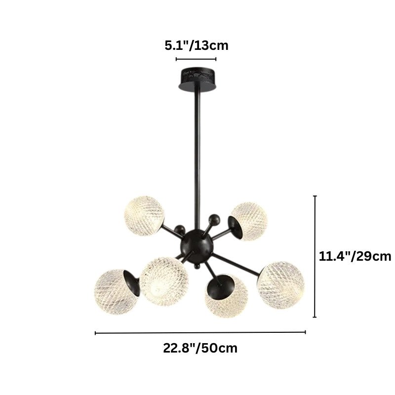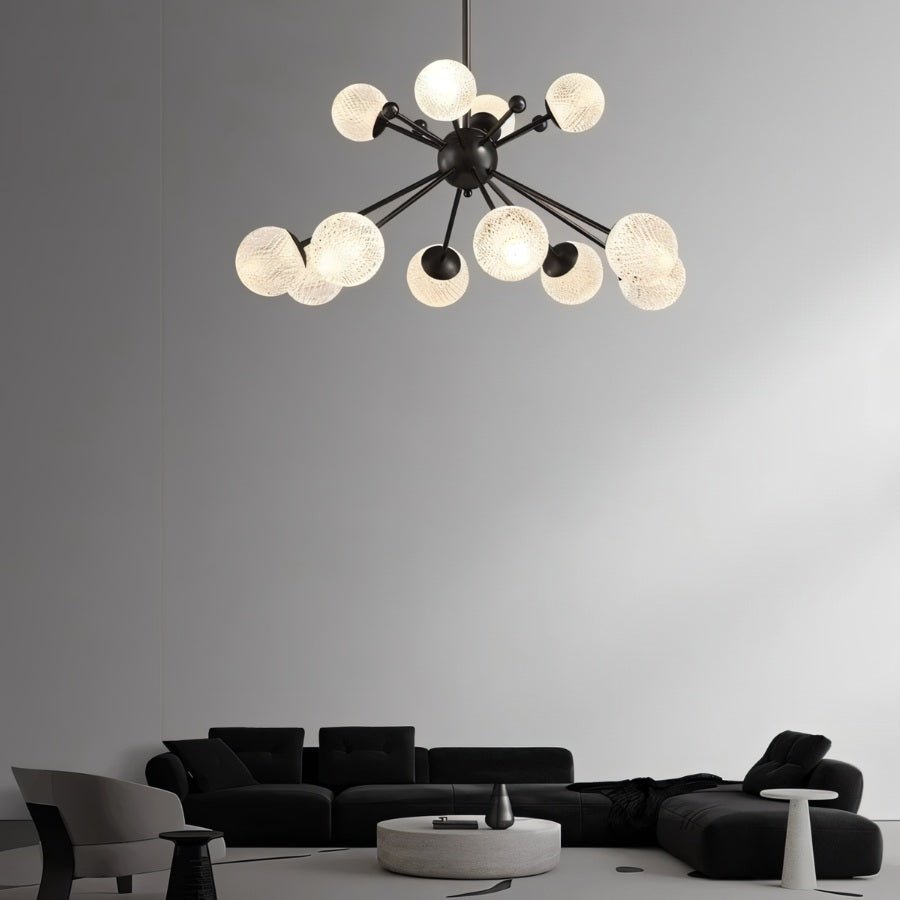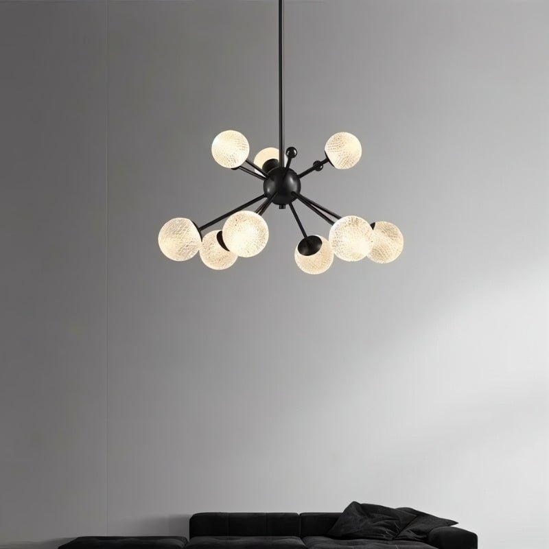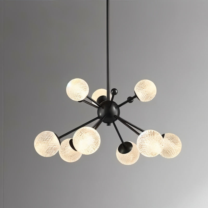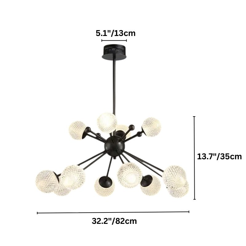 Pring chandelier features a dynamic, starburst-inspired design with multiple iron arms extending outward, each supporting a textured acrylic diffuser. This modern light fixture provides striking illumination, perfect for living rooms, dining areas, and high-ceiling spaces. Its sculptural form enhances contemporary and mid-century interiors.