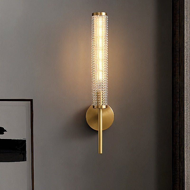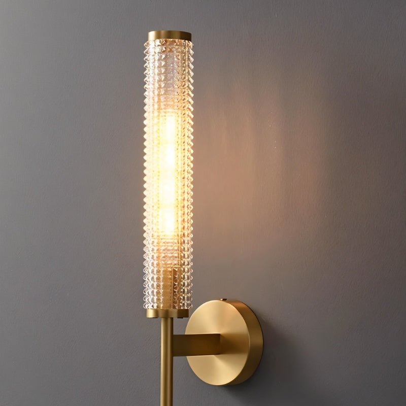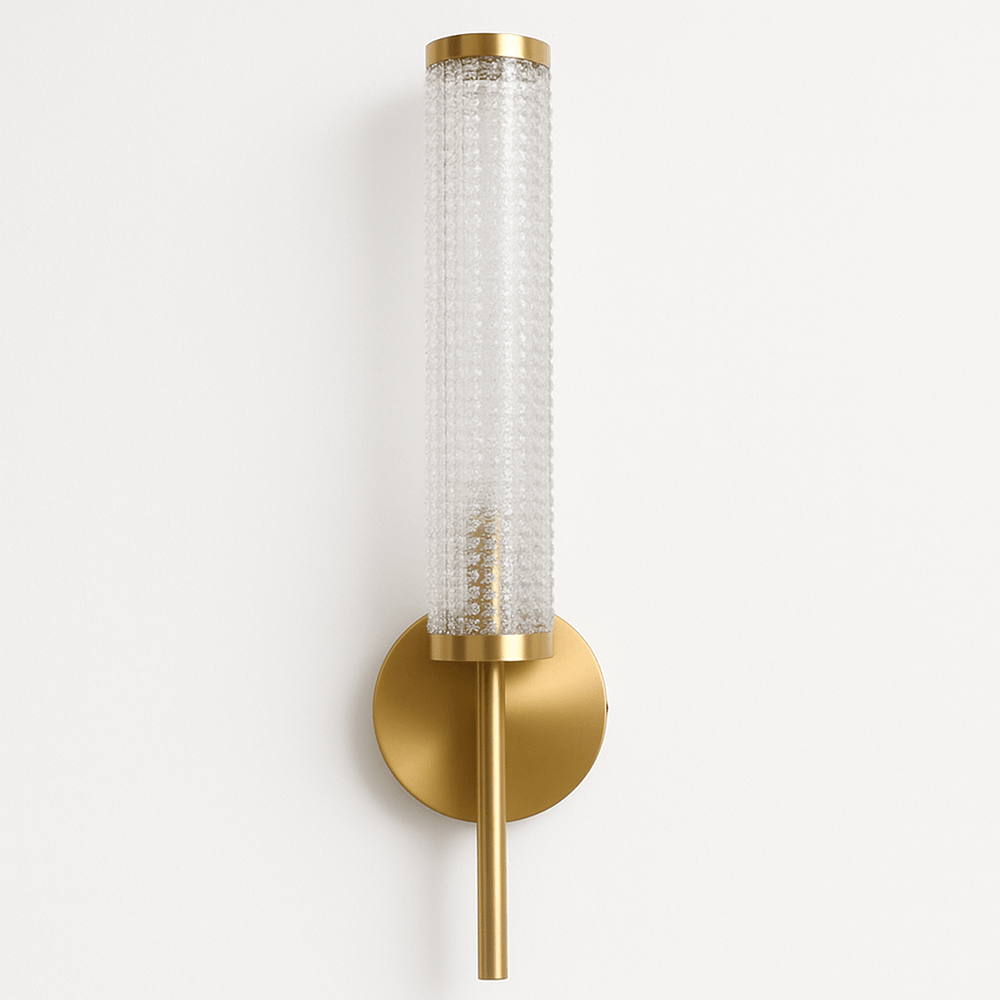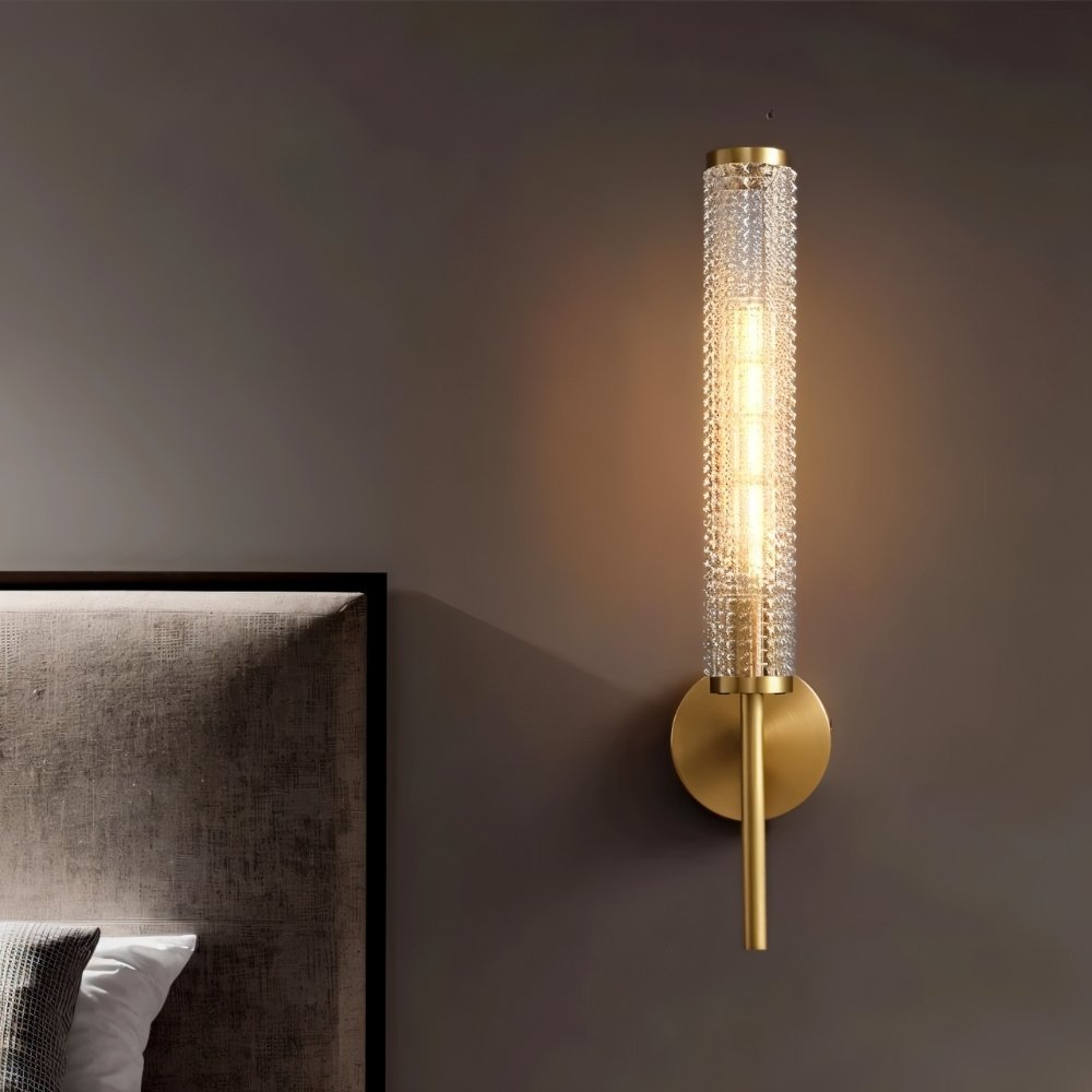 Pyra Wall Lamp is a sleek light fixture featuring a textured cylindrical glass shade that beautifully diffuses light, creating a warm, ambient glow. Available in brass or iron, its metal body adds a touch of luxury and durability. The minimalist round base and slender rod accentuate its modern aesthetic, making it ideal for hallways, living rooms, or as a bedside lamp. This wall lamp combines elegance and functionality, fitting seamlessly into both contemporary and classic interiors.