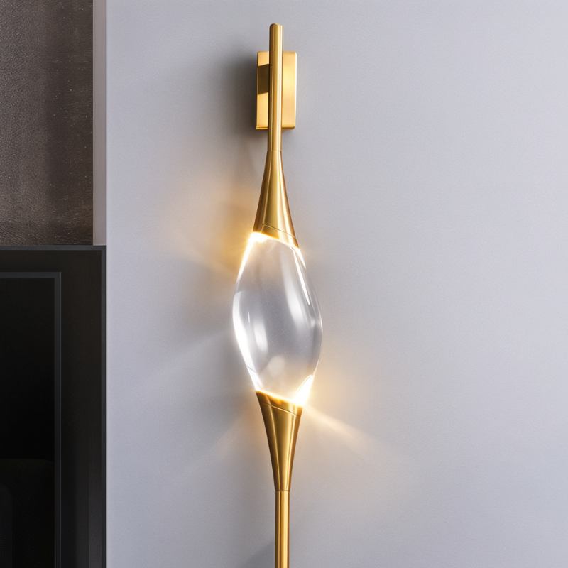 The Romilly Wall Lamp is constructed with a metal body featuring a brushed gold finish and a clear asymmetrical drop-like crystal integrated with LEDs.