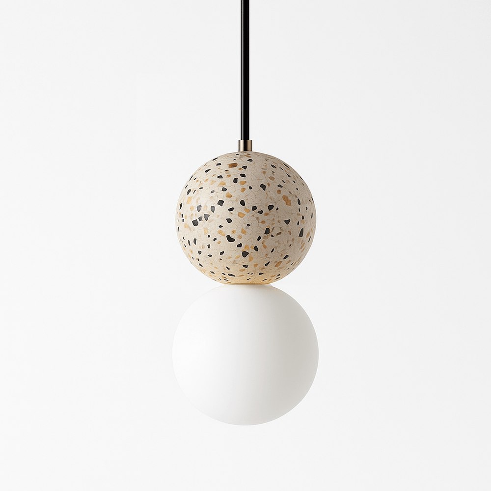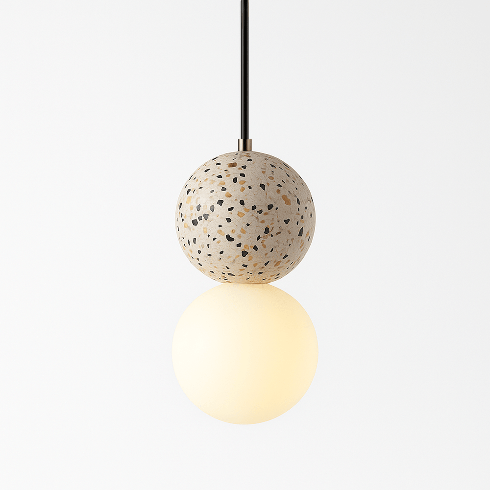 The Rondure Pendant Light combines opal glass and terrazzo stone, creating a striking contrast of smooth and textured elements.