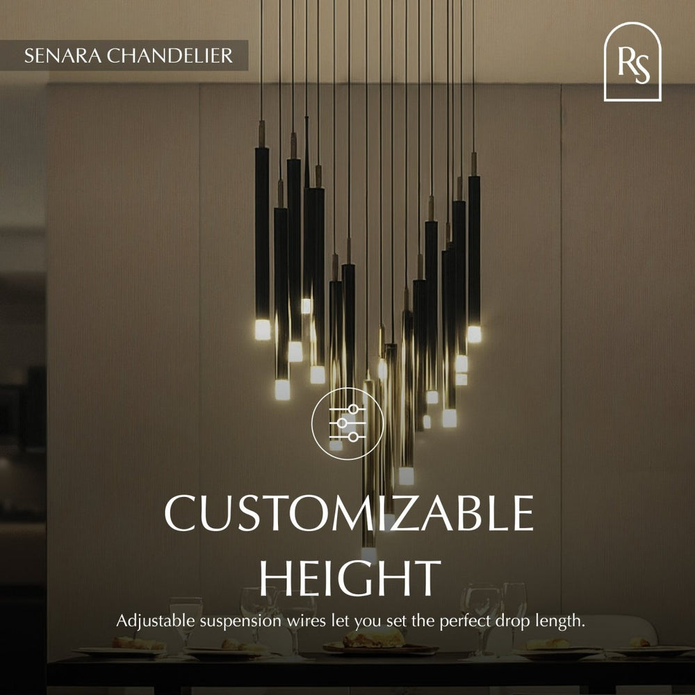 The Senara Chandelier's top-notch aluminum construction in a sleek black or gold finish offers a crisp modern aesthetic. Inspired by the enduring formation of wind chimes, this piece comprises slender tube pendants with an acrylic diffuser that lets gentle light pass through, giving the piece a unified and sumptuous appearance. The Senara has an appealing, minimalist, and contemporary style that will complement any space in your home, whether it be the living room, dining room, or bedroom.