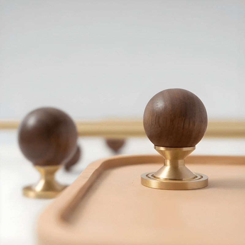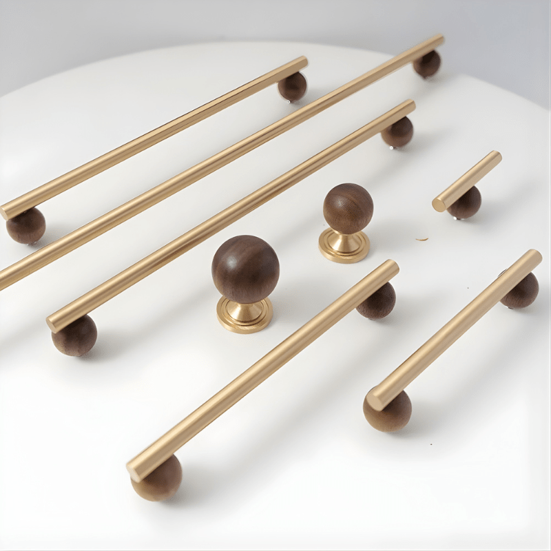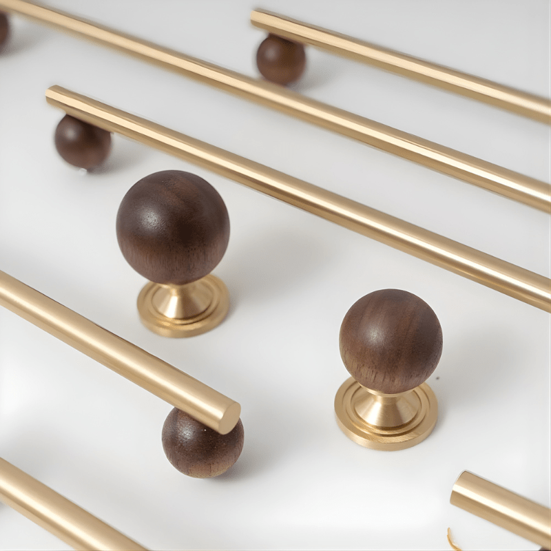 Refined brass and walnut knob and pull set with clean design and warm wood accents, offering modern elegance, tactile comfort, and balanced material contrast for cabinetry.