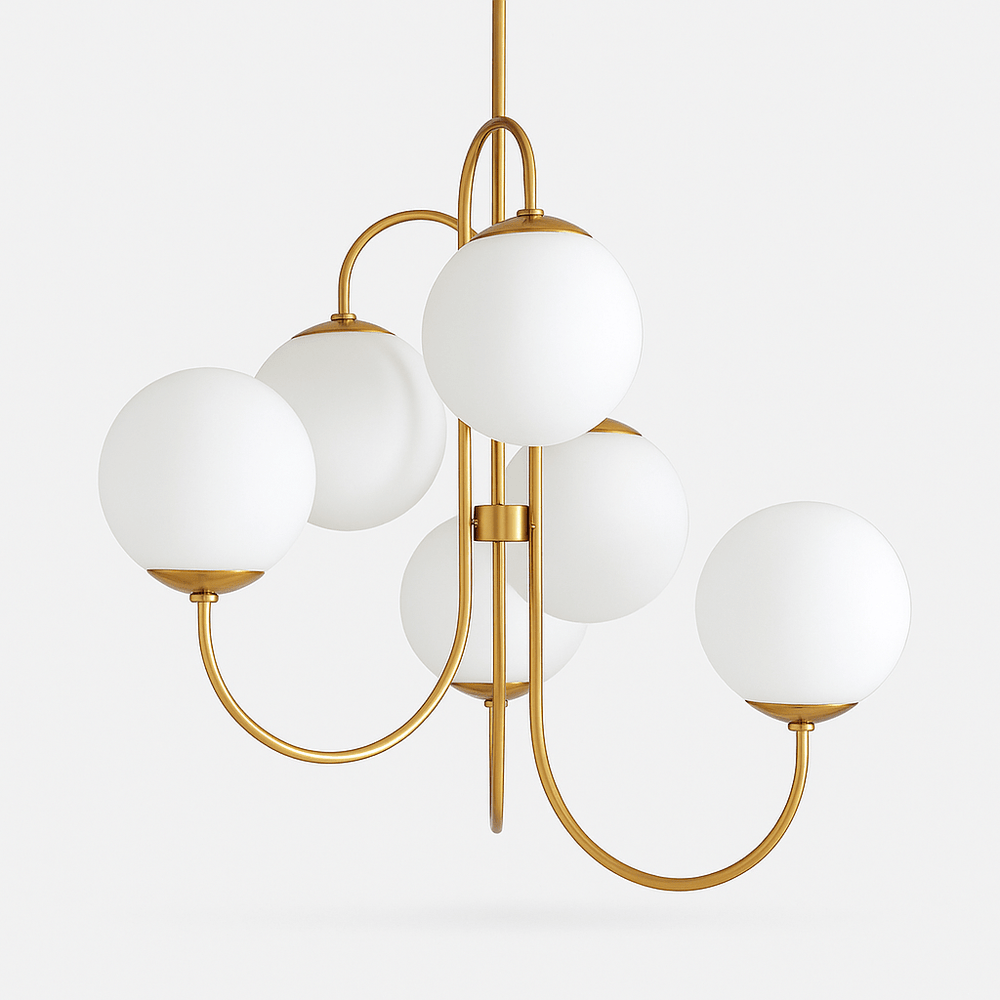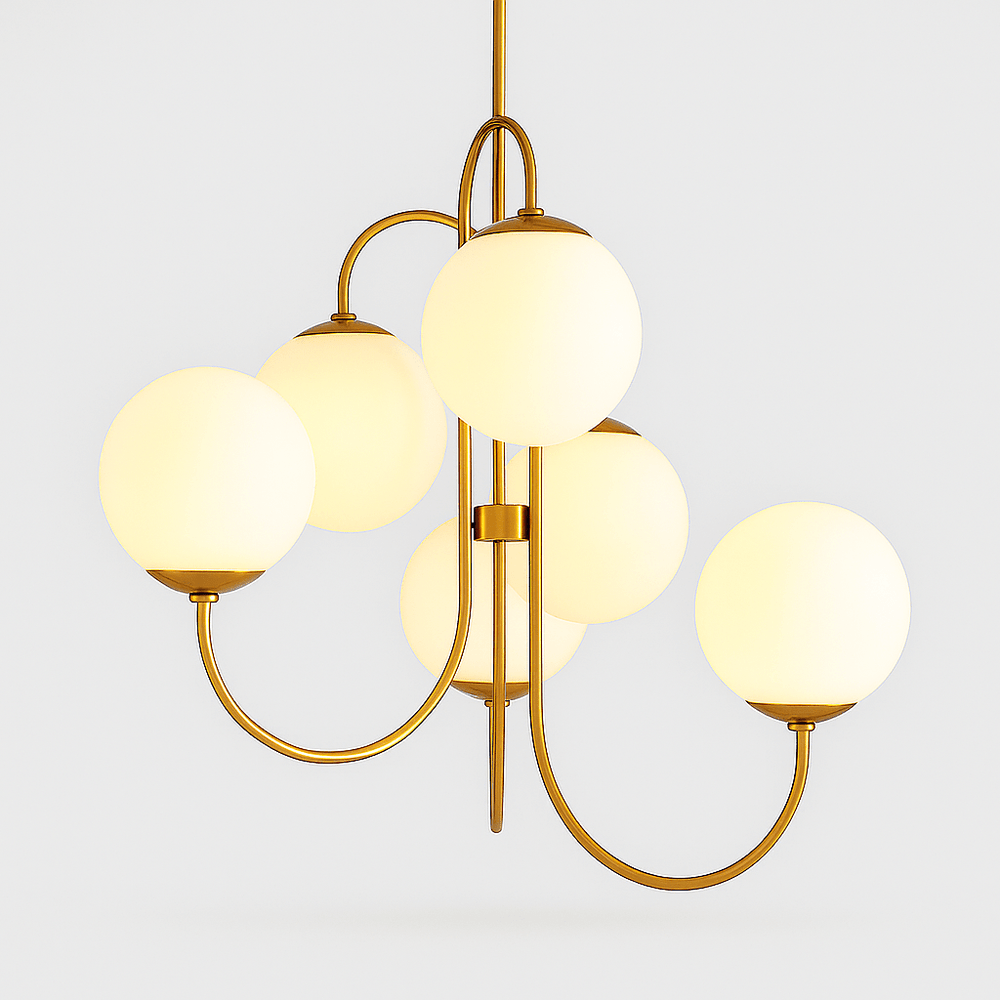 The Svanr Chandelier is a modern light fixture crafted from metal and glass, featuring curved arms with frosted globe shades for a balanced yet dynamic design. Its warm metallic finish complements contemporary and mid-century interiors, making it ideal for living rooms, dining areas, and entryways. The diffused glow provides soft, ambient illumination, enhancing both residential and commercial spaces. This light fixture adds depth and sophistication, serving as a striking focal point in any setting.