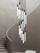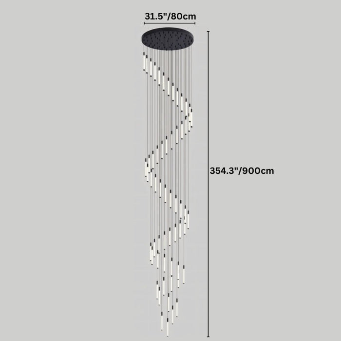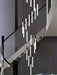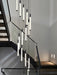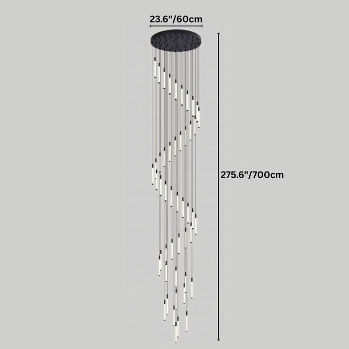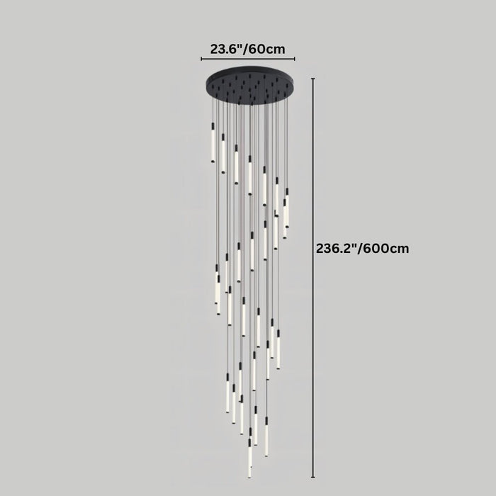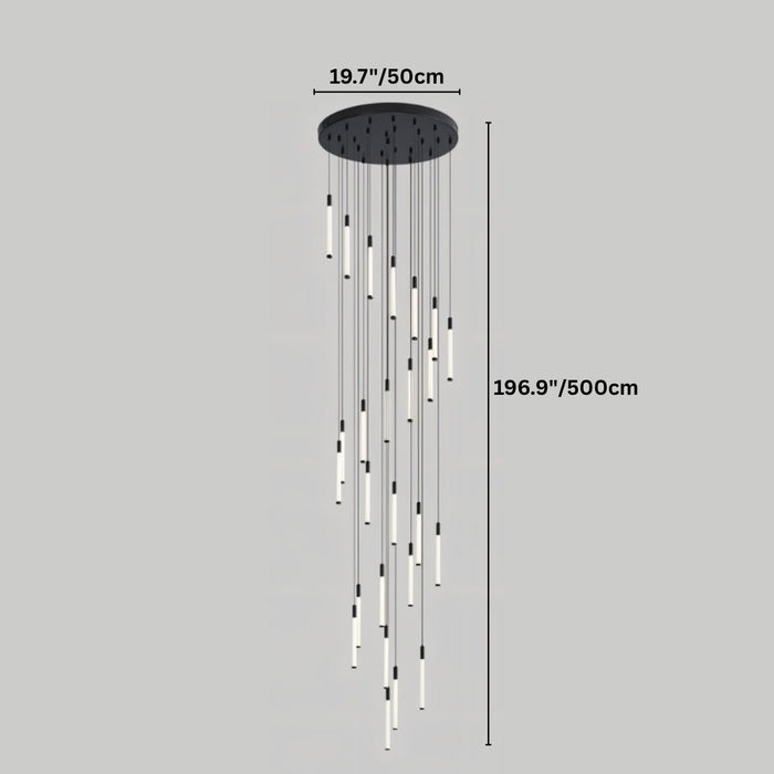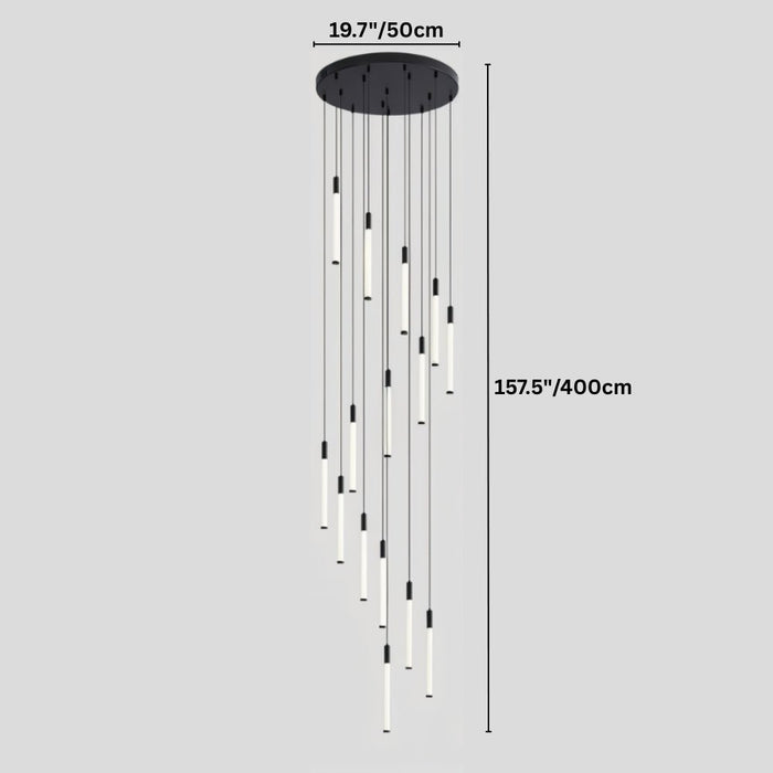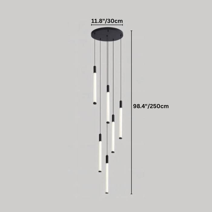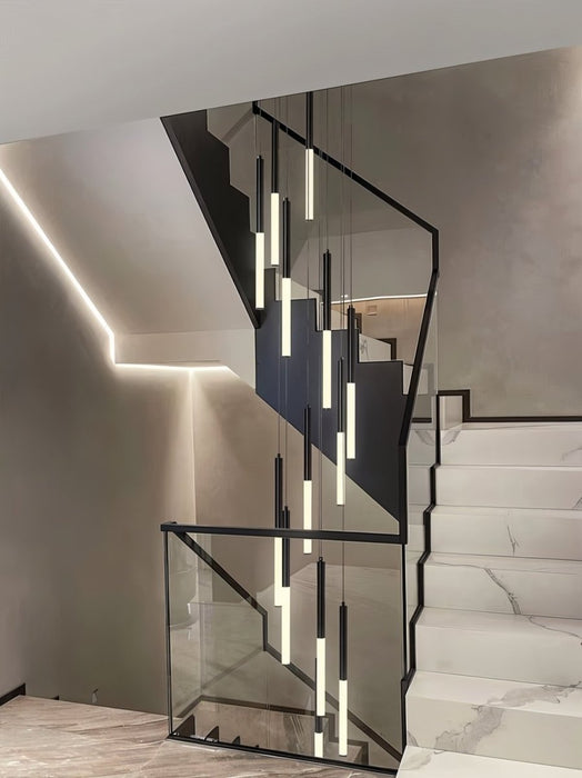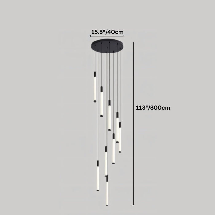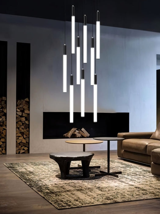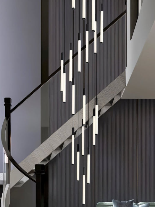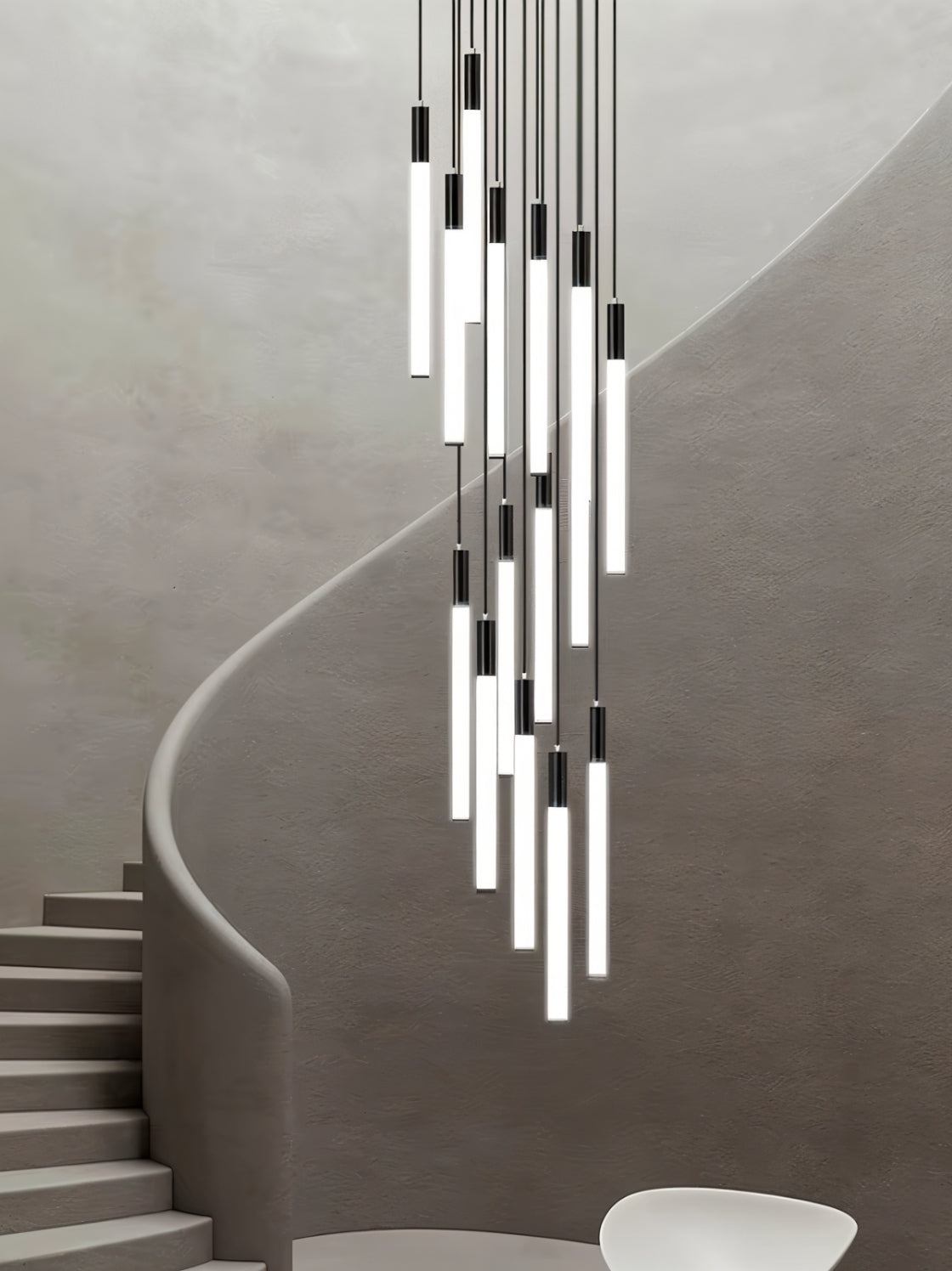 Tinara Staircase Chandelier is a sleek light fixture made from aluminum and frosted glass, featuring slim cylindrical pendants in staggered lengths. Its modern design combines a dark aluminum finish with softly glowing glass, creating a striking vertical flow. Ideal for staircases and double-height spaces, it offers balanced illumination and architectural elegance. Tinara adds a minimalist yet impactful statement to any contemporary interior.
