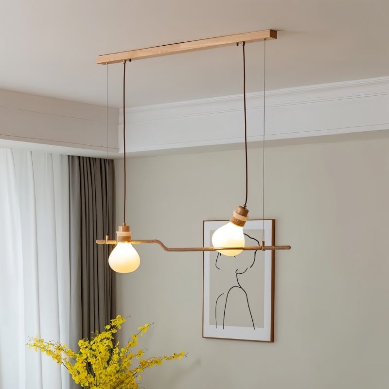 Warmly diffused light from frosted glass shades creates a cozy atmosphere — perfect for dining rooms or living spaces, complemented by a natural wood and hemp design.