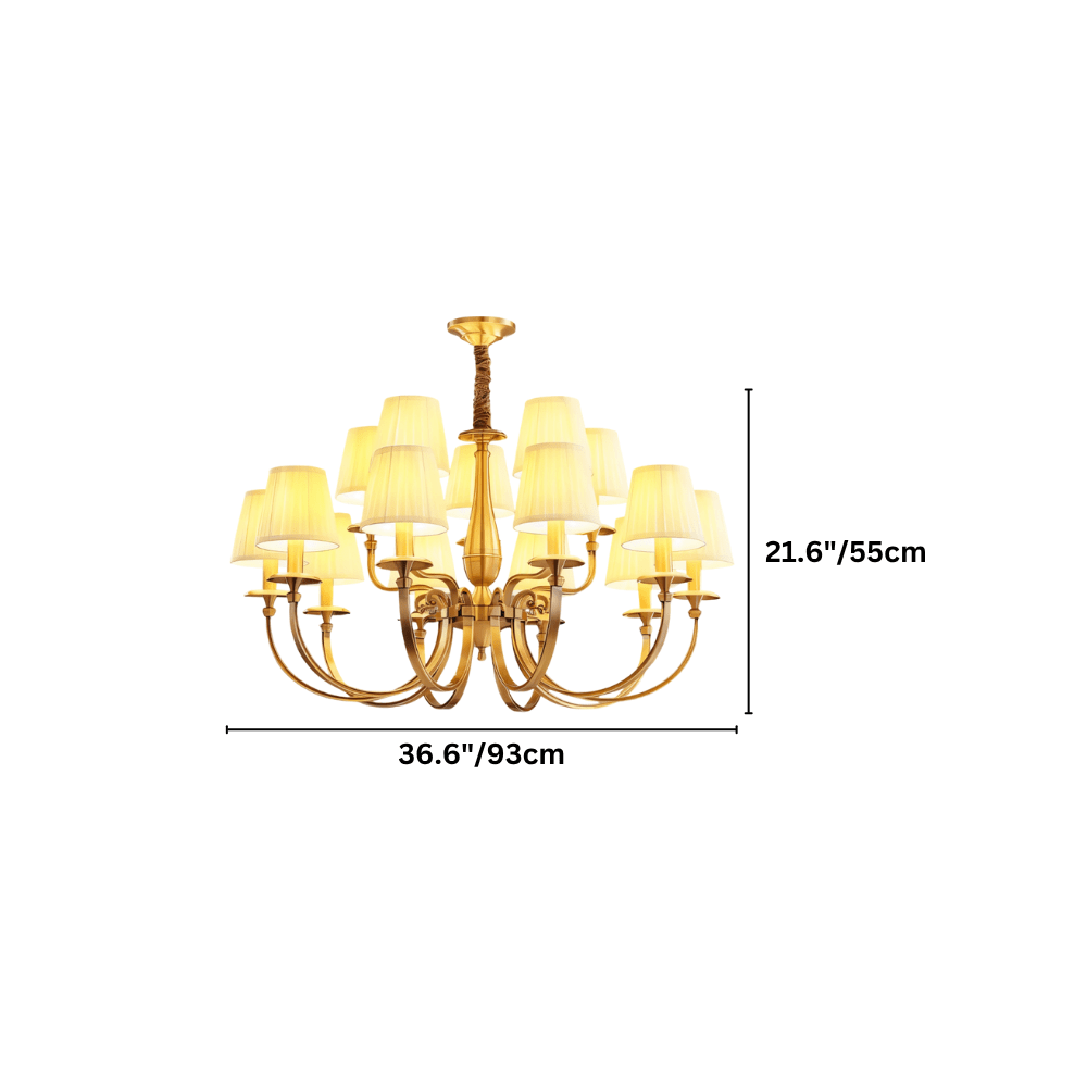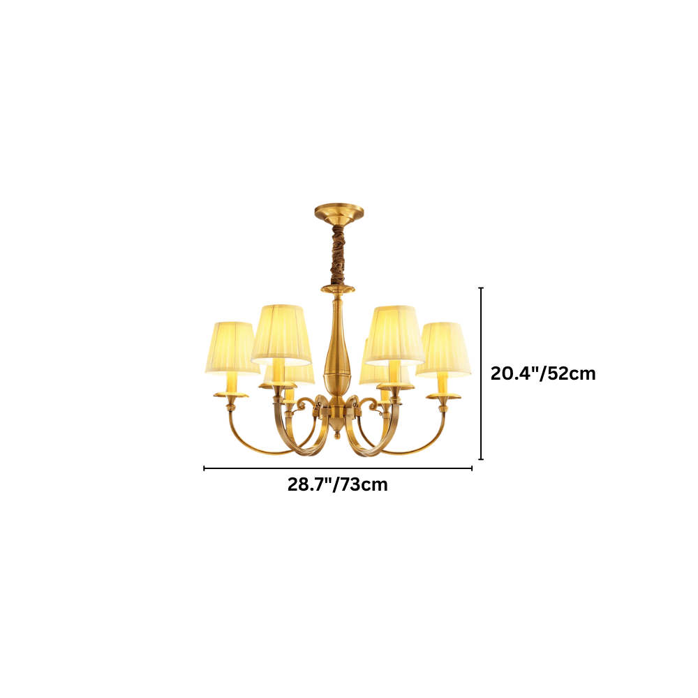 The chandelier is crafted from high-quality copper and features elegant cloth lampshades for a refined look.