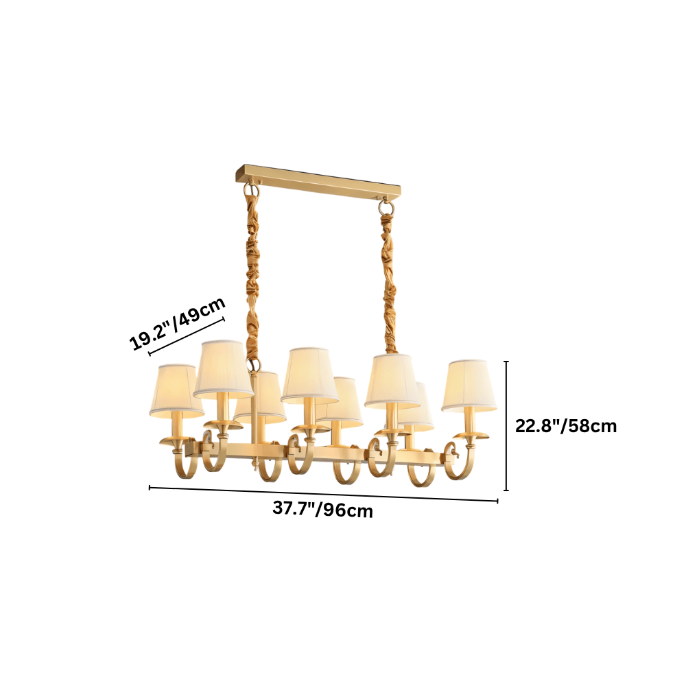Product Dimensions: Round - 3 Heads - 18.8" x 20.4" / 48 x 52cm / 30W, Round - 6 Heads - 28.7" x 20.4" / 73 x 52cm / 60W, Round - 8 Heads - 32.2" x 20.4" / 82 x 52cm / 80W, Round - 10 Heads - 36.6" x 20.4" / 93 x 52cm / 100W, Round - 15 Heads - 36.6" x 21.6" / 93 x 55cm / 150W, Linear - 8 Heads - 37.7" x 22.8" x 19.2" / 96 x 58 x 49cm / 80W Weight: 4.4Kg, 6.8Kg, 8.8Kg, 11.5Kg, 14.2Kg, 9.6Kg Material: Copper, Cloth Finish: Brass, White Light Source: LED Light Bulb (Replaceable) Bulb Included: Yes Number of Bulbs: 3, 6, 8, 10, 15 Bulb Base: E14 Dimmable: Upon Request Wattage: 30W, 60W, 80W, 100W, 150W Lumens: 100 lm/W Voltage: 90-260VAC Installation Type: Hardwired Chain/Cord Length: Up to 3.3ft (1 meter) Adjustable Cord: Yes Sloped Ceiling Compatible?: Yes Certifications: UL, CCC, CE, CQC, EMC, FCC, GS, LVD, PSE, ROHS, SAA, and VDE