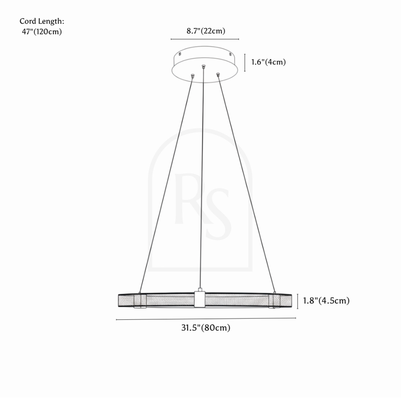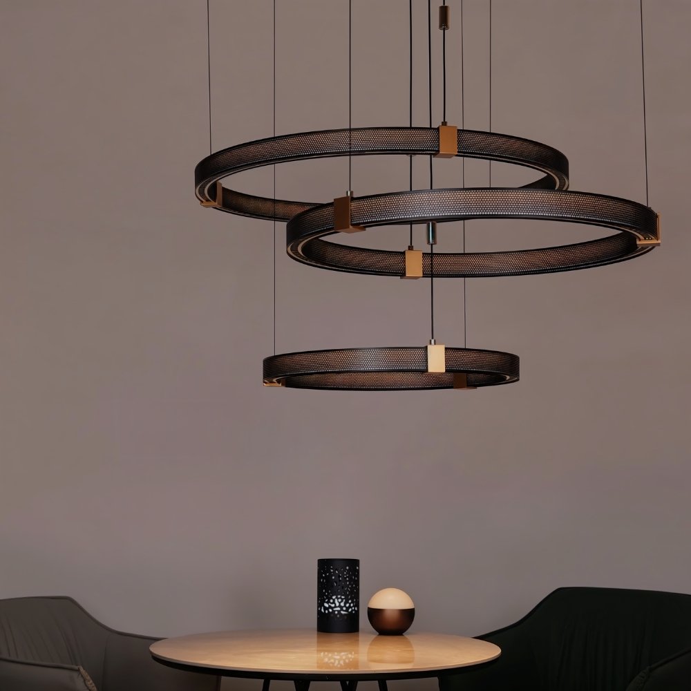 Perforated aluminum rings and acrylic diffusers deliver warm, ambient lighting with adjustable height — perfect for dining rooms and contemporary living spaces.