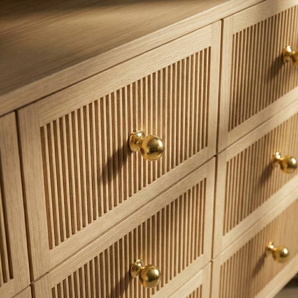 These solid brass handles feature a stylish finish and a modern design with vertical lines for a touch of sophistication. The knurled texture adds a secure grip, ensuring both style and functionality in your space.