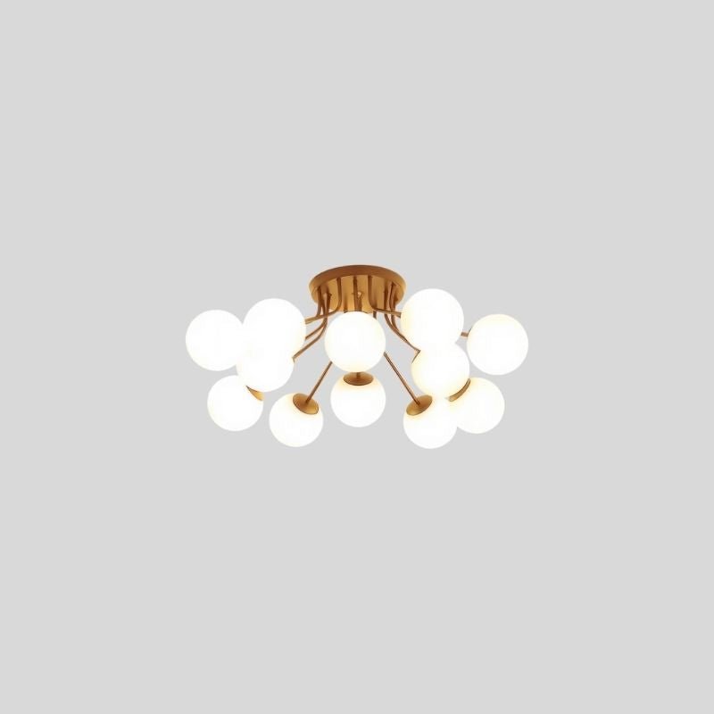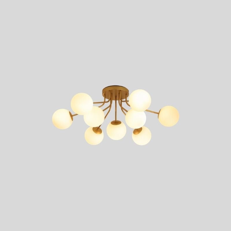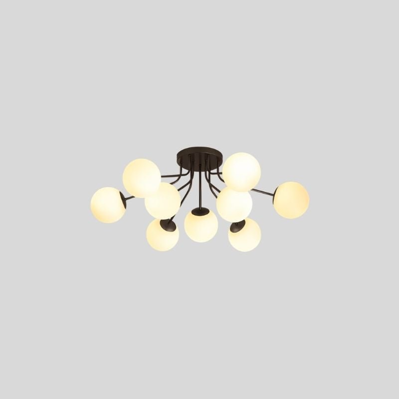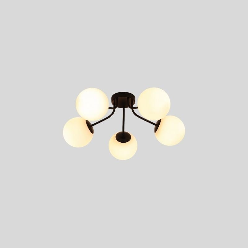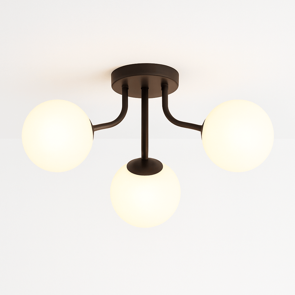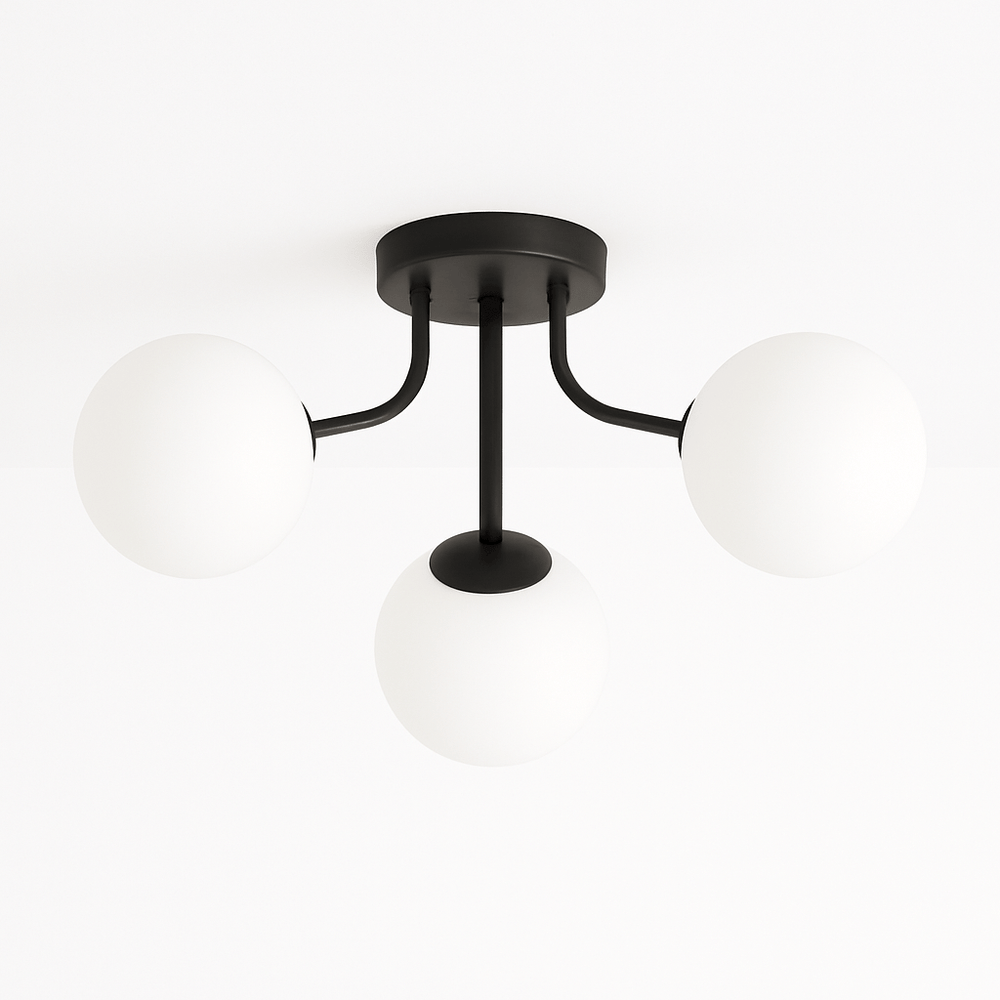 The Veylo Ceiling Light features a modern, sculptural design with spherical glass shades and a sleek iron frame. Its compact ceiling-mounted structure makes it ideal for low to mid-height ceilings. The fixture comes in two color options, complementing various interior styles. A refined choice for contemporary spaces, this light fixture enhances ambiance with its soft, diffused glow.