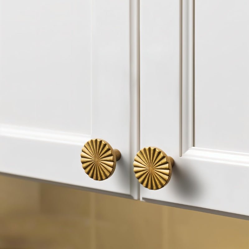 Vibora knob features a radial sunburst design with textured grooves radiating outward, adding depth and dimension. Its round shape and fluted top offer a refined, sculptural look, enhanced by the warm vintage brass finish. It is made from solid brass and combines durability with timeless elegance, fitting both traditional and contemporary interiors.
