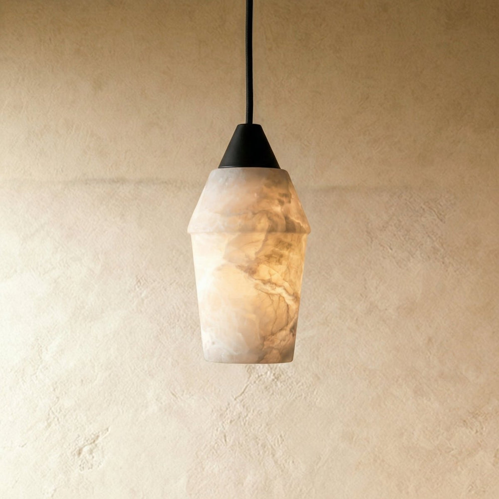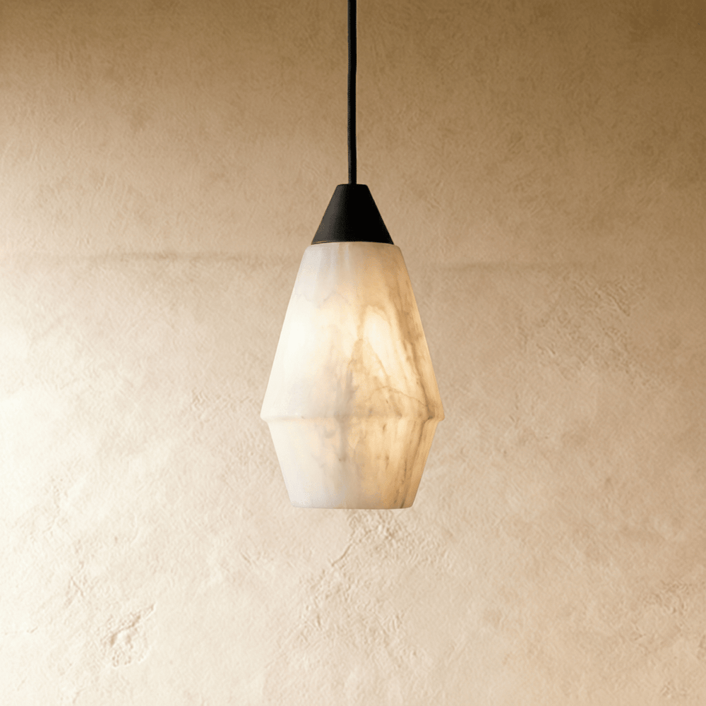 The geometric composition of the Viviana Alabaster Pendant Light enhances the space by creating a subtle yet sophisticated visual interest, adding elegance and modernity to any room.