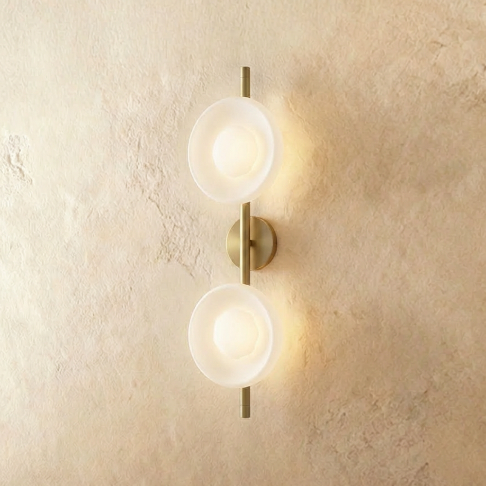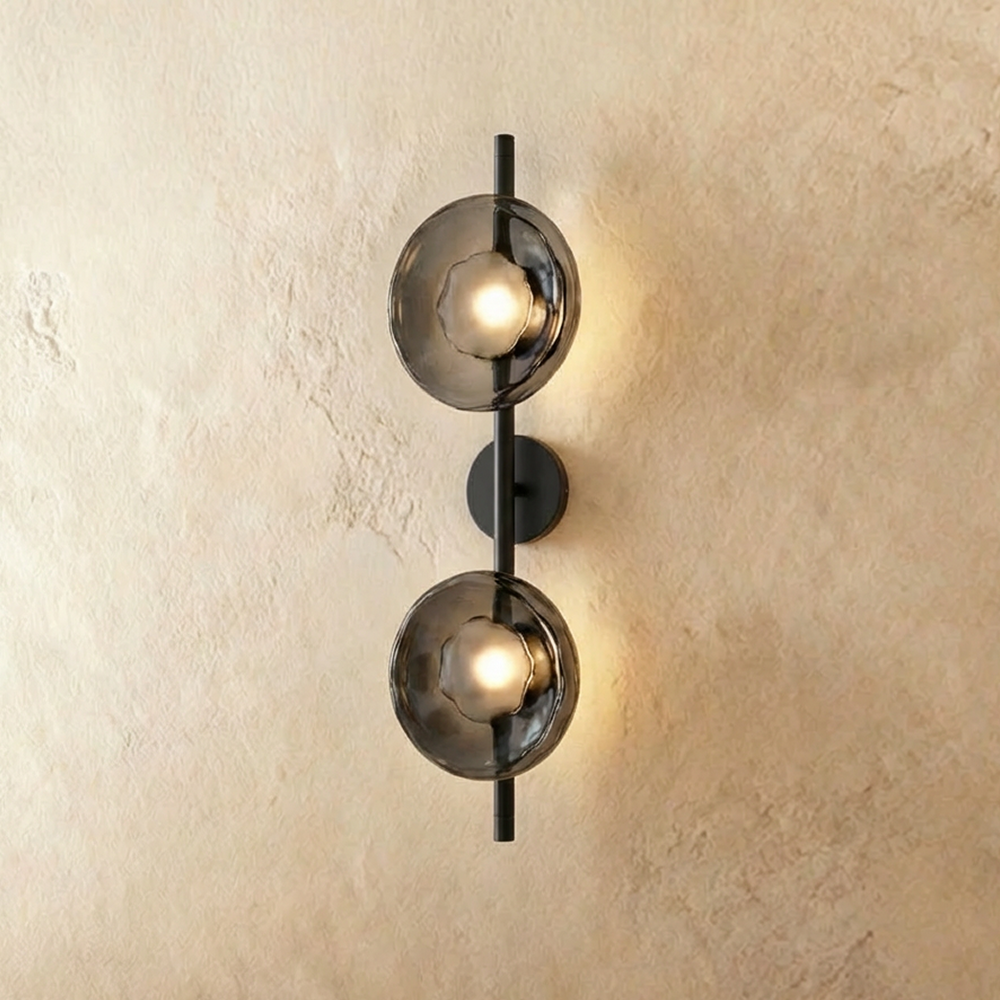 The Vynestris Wall Lamp is a modern light fixture that seamlessly blends metal and glass for a striking visual impact. Designed with a sleek vertical rod supporting two glass shades, this wall-mounted fixture offers a sophisticated aesthetic. The smoked or clear glass diffuses light elegantly, creating a warm ambiance. The high-quality metal construction ensures durability, while the glass elements add a refined touch. Perfect for accent lighting, the fixture pairs well with modern and industrial interiors.