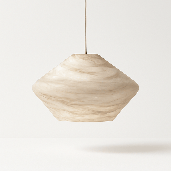 Alabaster and metal construction create a sleek, modern pendant with a soft diffused glow.