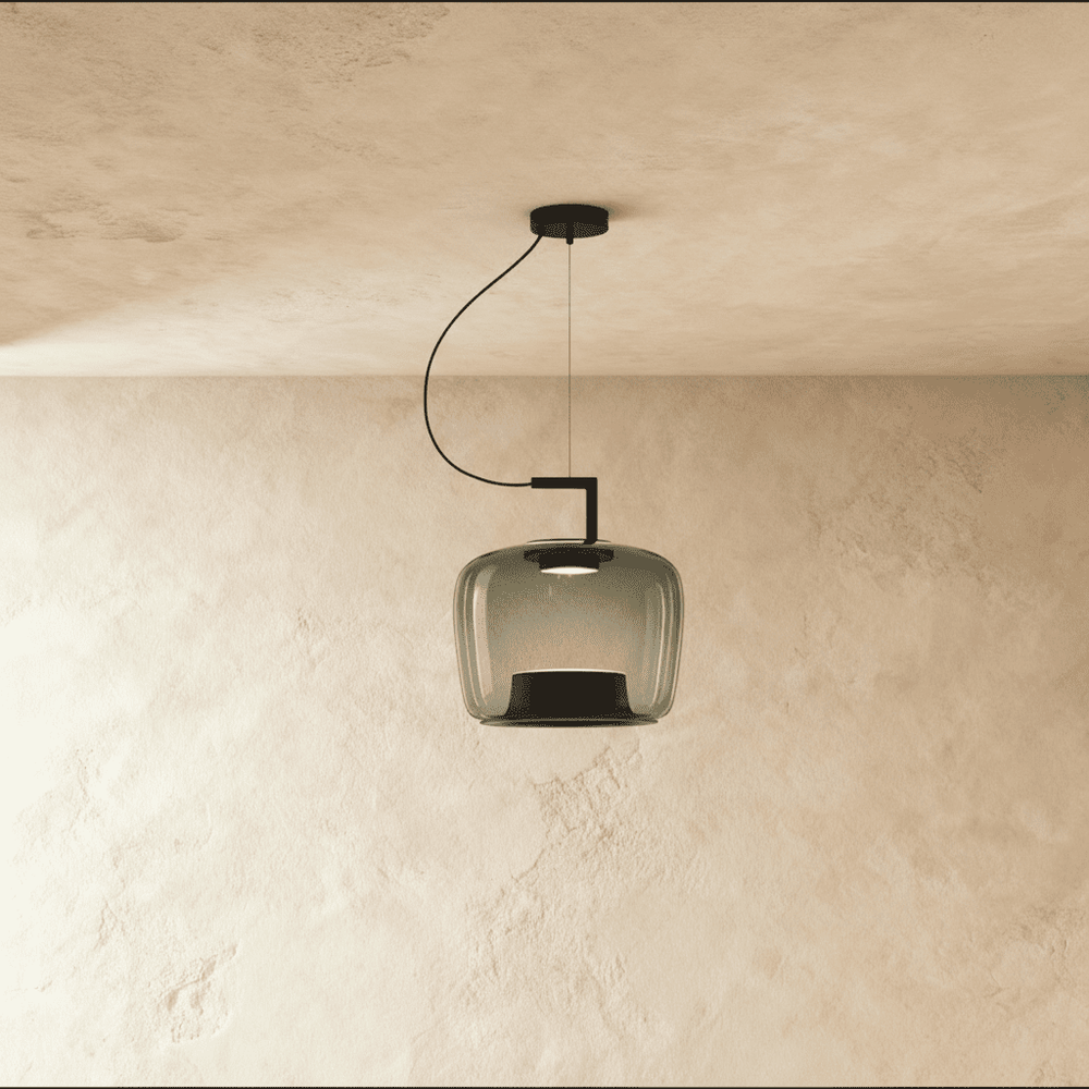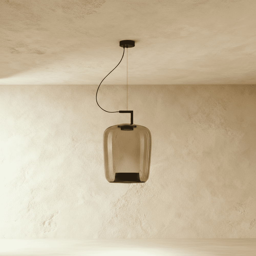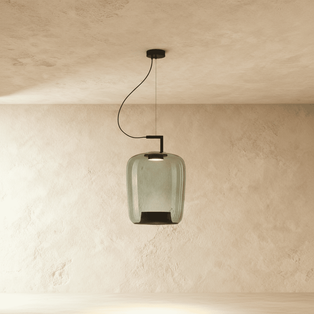 The Yoruba Pendant Light seamlessly integrates with modern and vintage decor through its blend of contemporary metal frame and vintage-inspired glass lampshade, available in amber, grey, and green, creating a sophisticated and inviting ambiance.