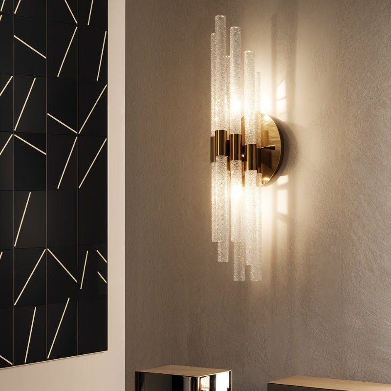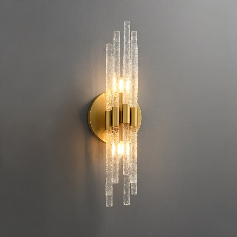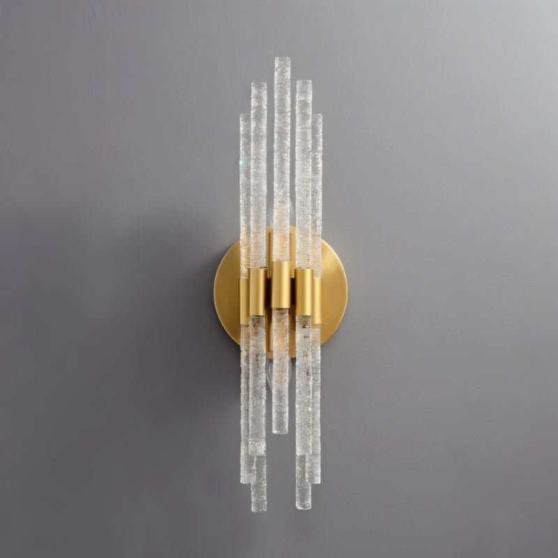 Yozan Wall Lamp is an elegant light fixture crafted with high-quality glass and a choice of iron or brass for the base, providing both durability and style. Its design showcases vertically arranged, textured glass rods that beautifully refract and diffuse light, creating a warm, ambient glow. With a minimalist round backplate, this wall lamp integrates seamlessly into various settings, making it ideal for hallways, living rooms, bedrooms, and entryways.