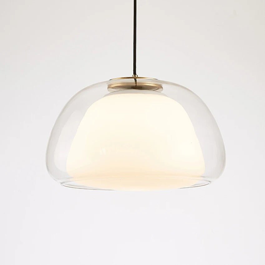 A sleek, modern pendant light with elegant glass and cream accents, perfect for contemporary spaces.