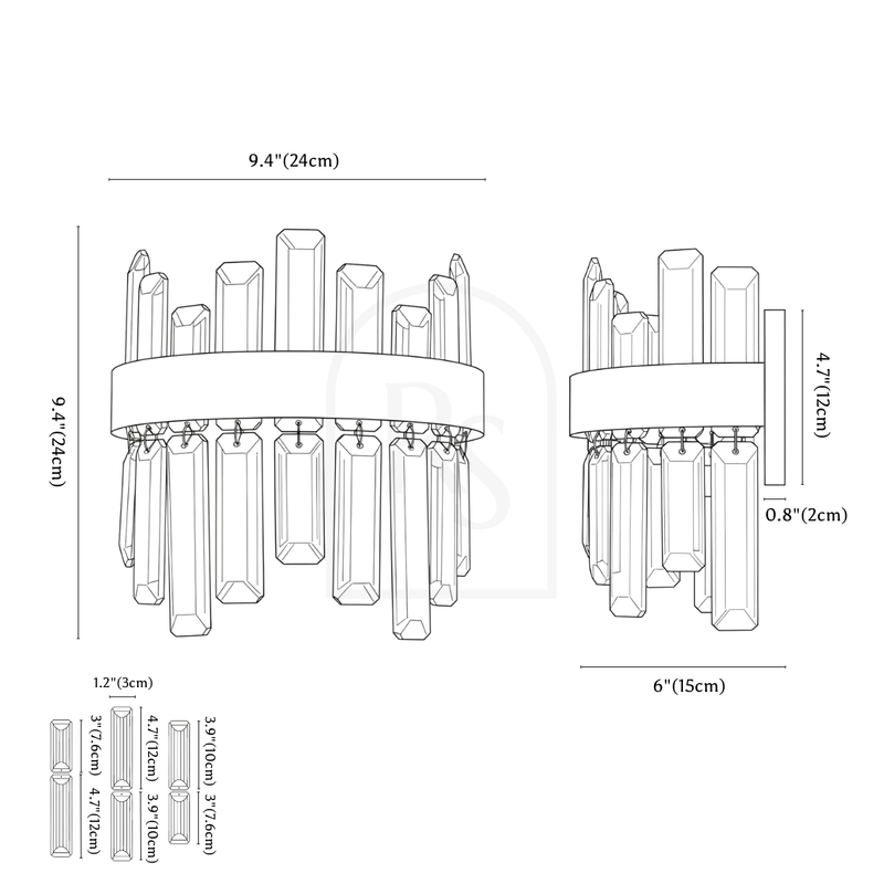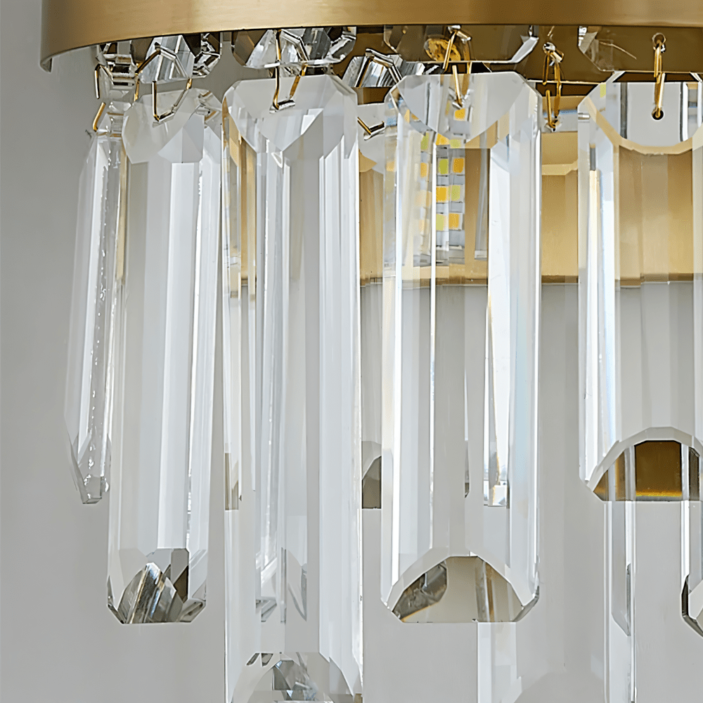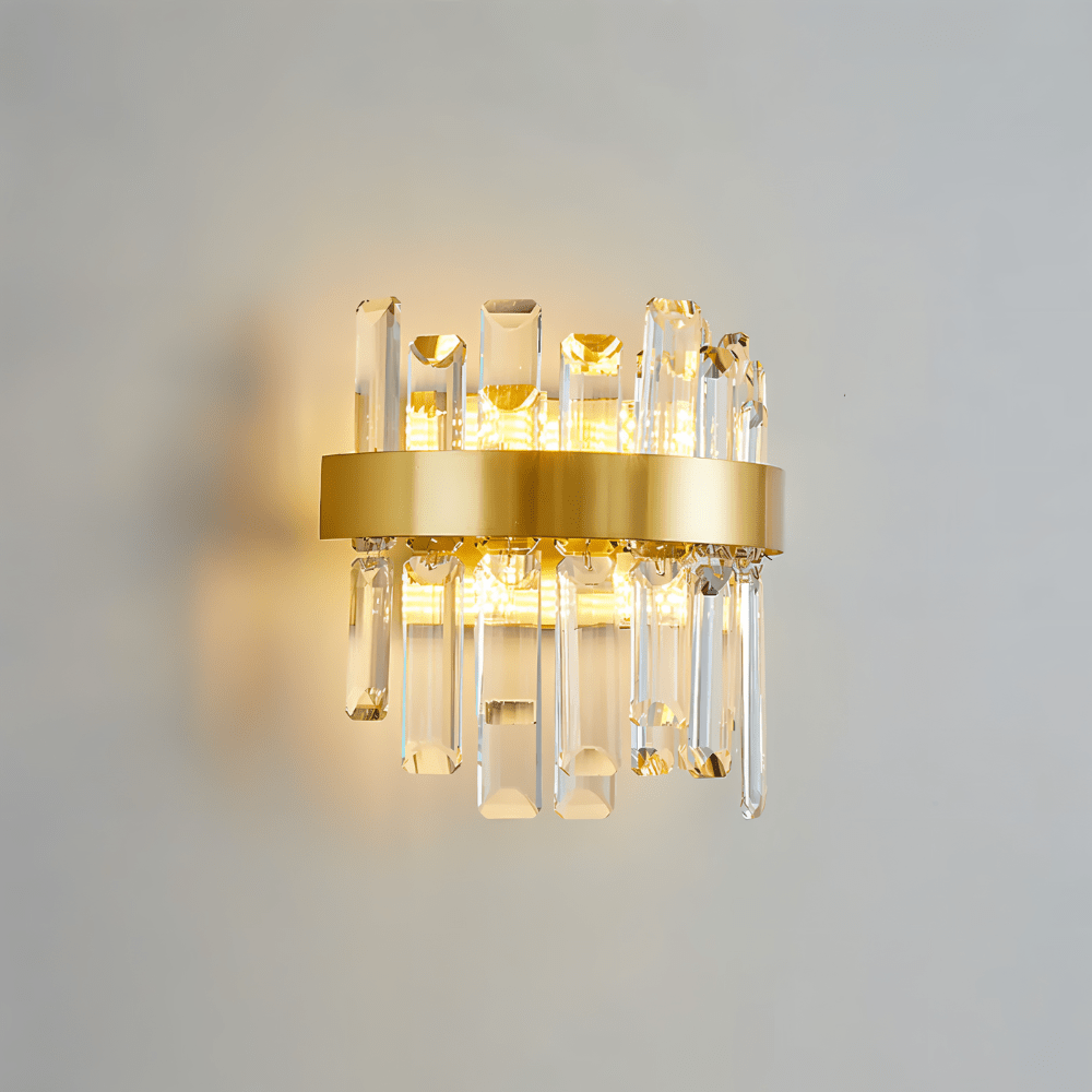 Crafted from a blend of copper, iron, and a crystal lampshade, the Zaffo Wall Lamp is a sophisticated light fixture that fuses elegance with structural precision. Its design features vertically aligned crystal rods encased in a matte gold ring, offering a luminous play of light and shadow. This wall-mounted fixture brings a luxurious glow, ideal for accenting living rooms, hallways, or upscale commercial interiors. The geometric balance and reflective crystal elements make it a statement piece. Its robust metal base ensures durability without compromising visual delicacy.