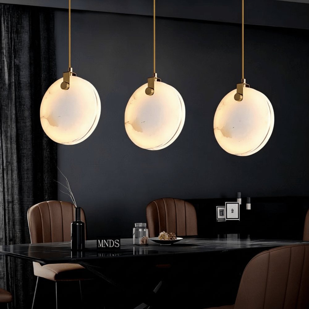 The Zenqua Pendant Light is a sophisticated light fixture made from copper and alabaster, featuring a spherical alabaster shade that emits a warm, ambient glow. Its minimalist design and brass suspension create a luxurious, modern aesthetic, ideal for bedrooms, living rooms, or dining areas. The natural veining in the alabaster adds unique texture, enhancing any contemporary interior with serene elegance.