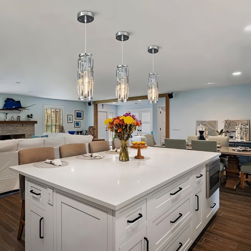 The Zevar Pendant Light combines an iron frame with crystal elements, creating a structured yet luminous design. Its geometric crystal arrangement refracts light, adding depth and sophistication. Available in 1, 3, 4, and 5-light configurations and three color options, it suits kitchens, dining areas, and entryways. The suspended design offers a balanced blend of industrial strength and modern elegance. Ideal for both residential and commercial spaces, this light fixture enhances ambient and task lighting.