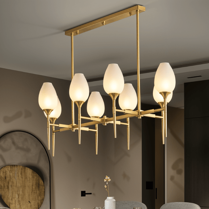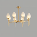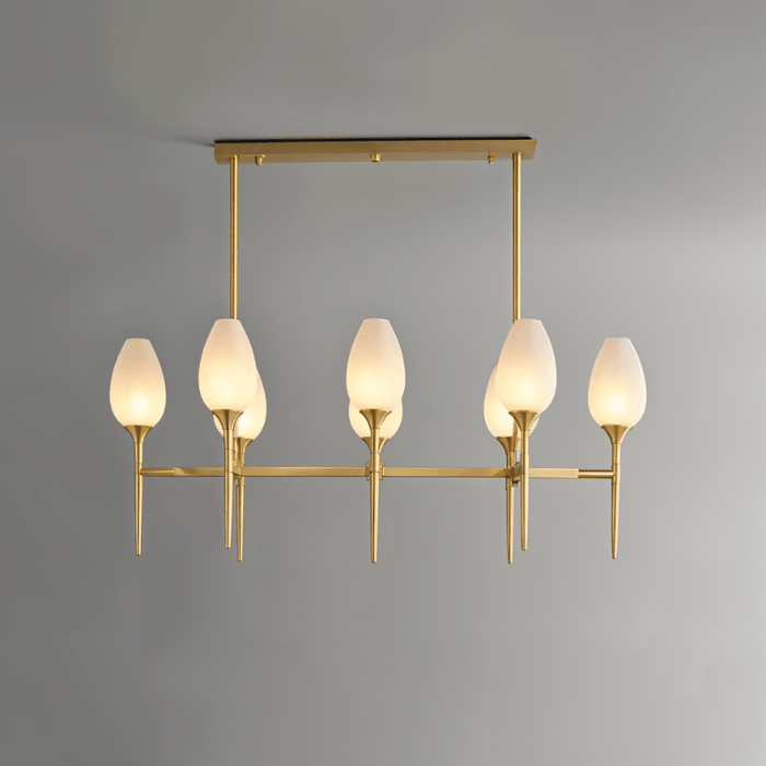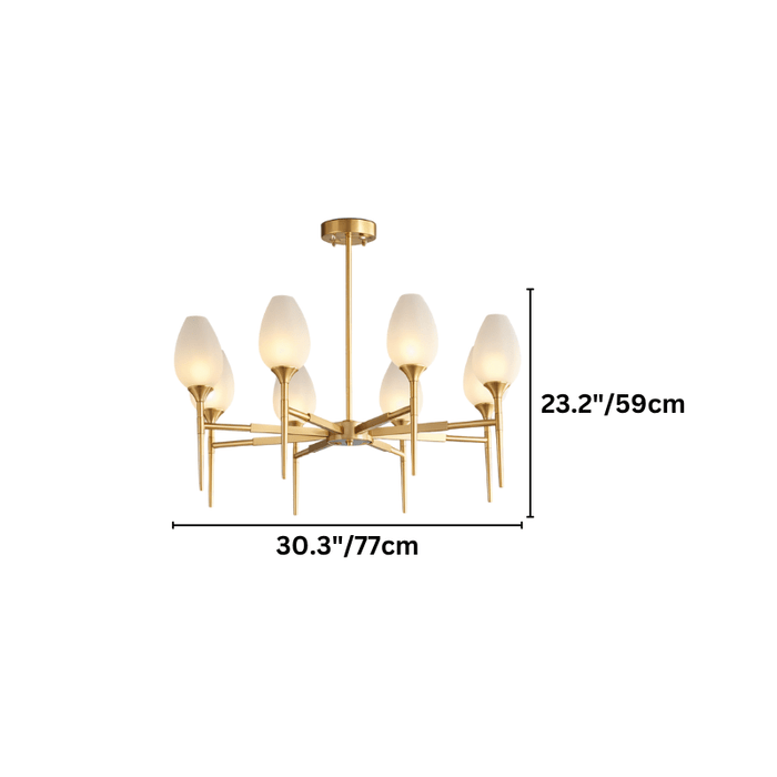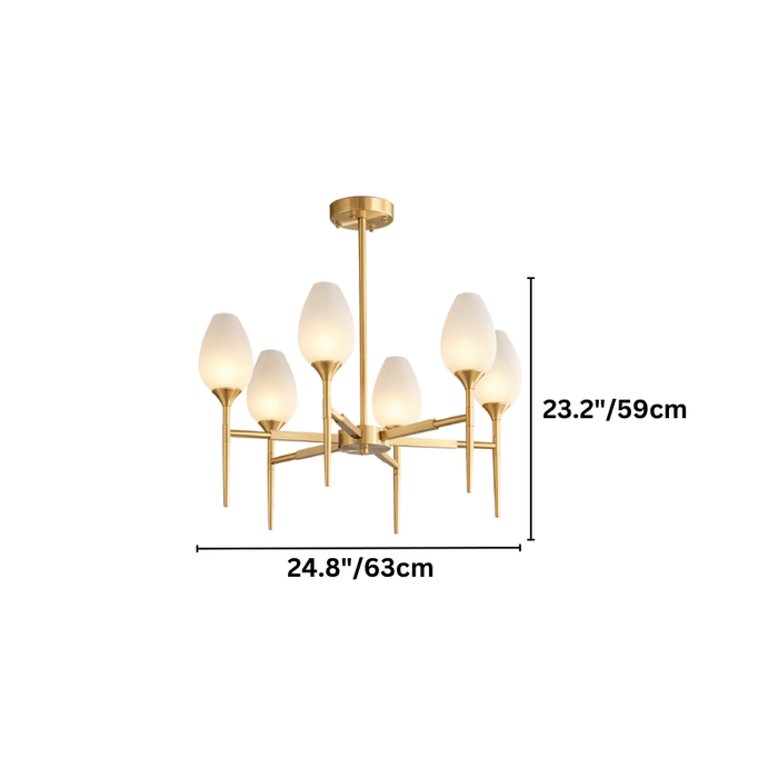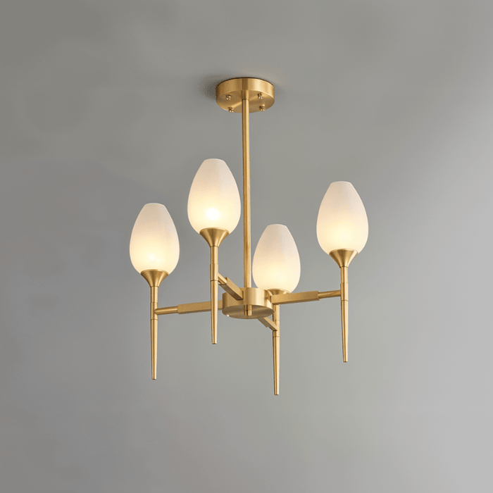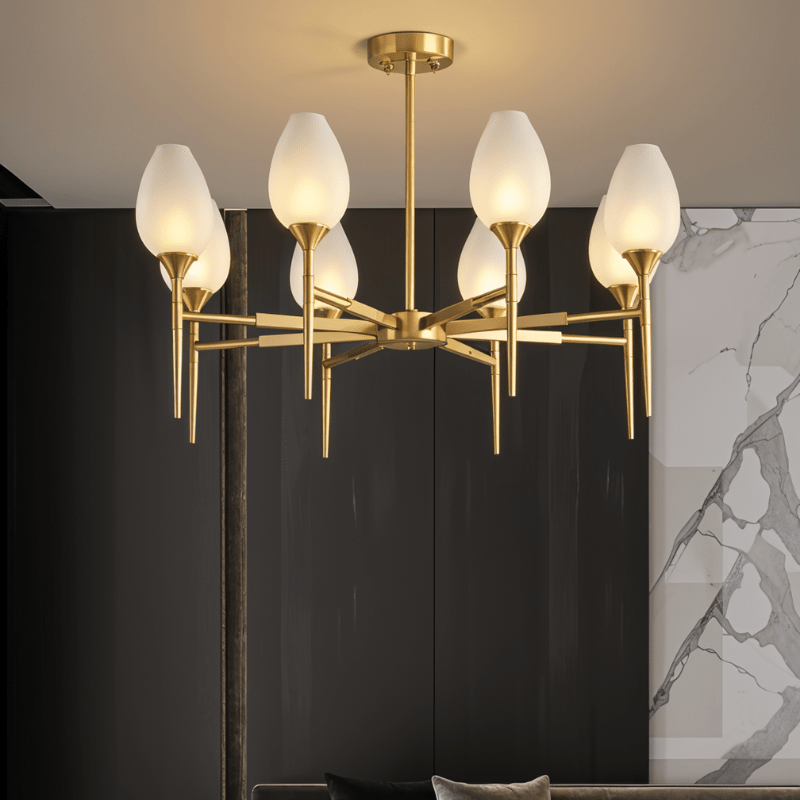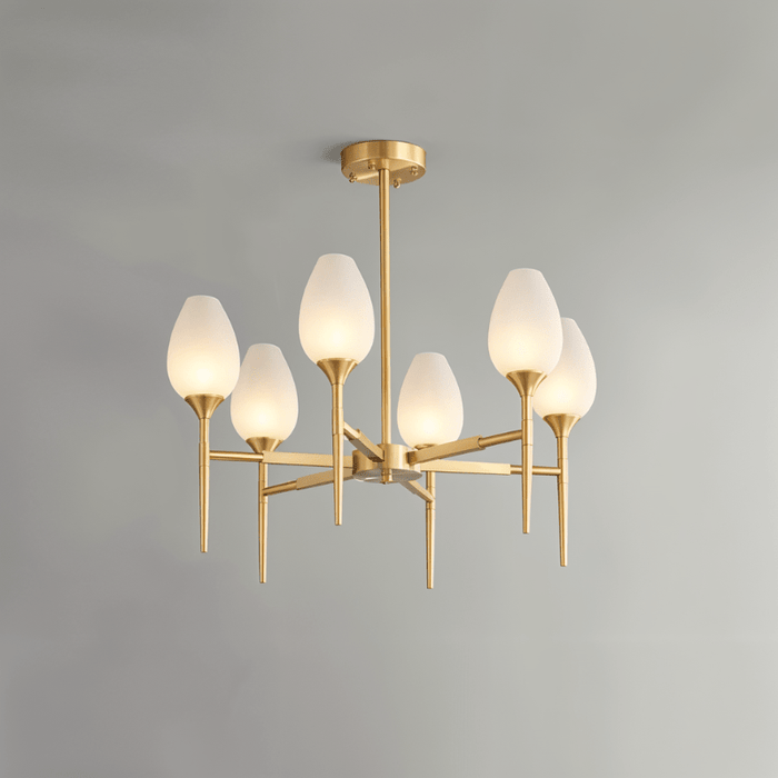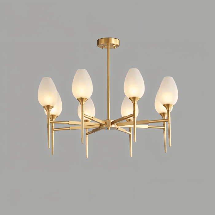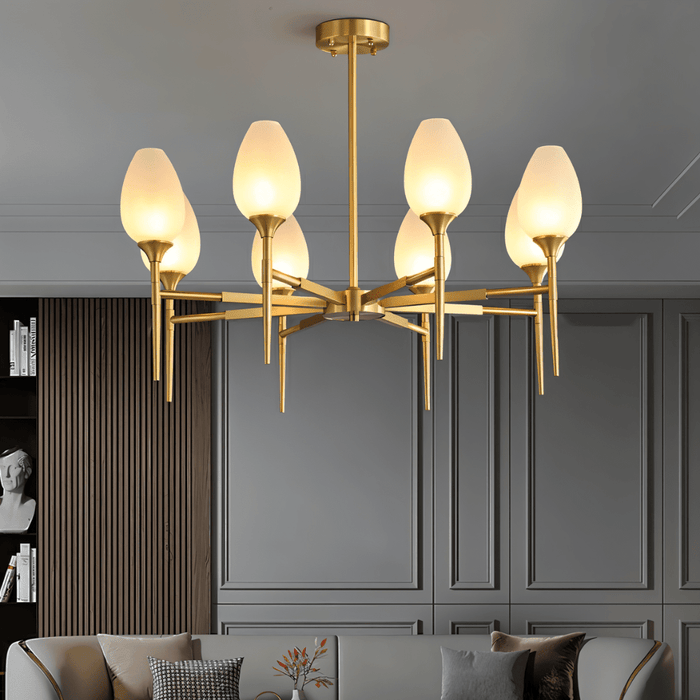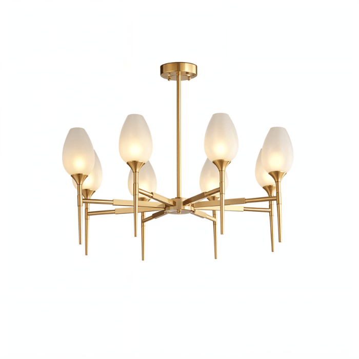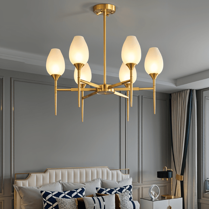 The Zylin Chandelier is a striking light fixture crafted from premium copper and complemented by elegant glass lampshades. Its design features sleek, tulip-inspired shades and a refined golden finish that brings a touch of modern luxury to any space. It offers versatile styling options to suit bedrooms, dining rooms, or living areas. The sophisticated structure blends artful geometry with warm ambient lighting, creating a statement centerpiece. This light fixture seamlessly combines contemporary aesthetics with timeless elegance for upscale interiors.